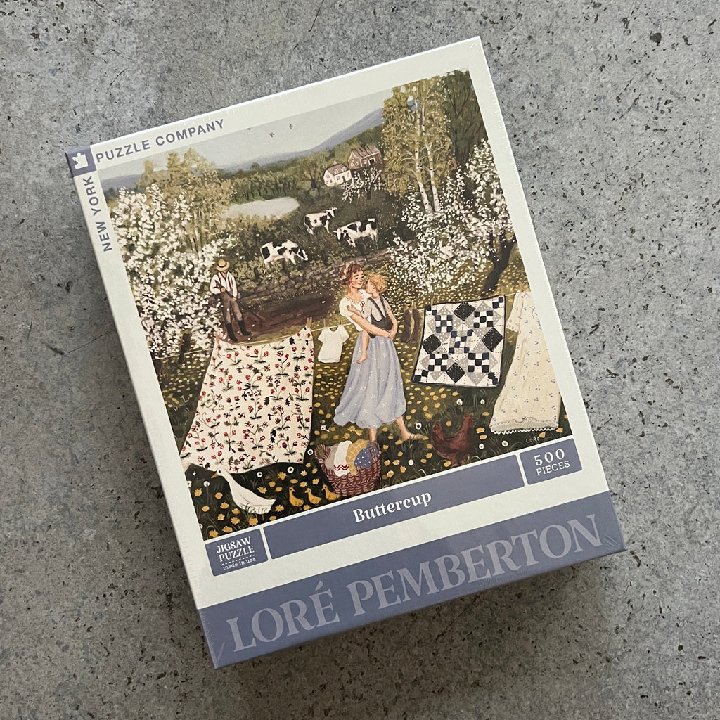 MannaIn this 500 piece puzzle buttercups cover the ground as a mother takes a break from hanging laundry to share a tender moment with her young child. A farmer plots land for planting and cows leisurely eat away at the grass. Original Painting by Artist Loré Pemberton.