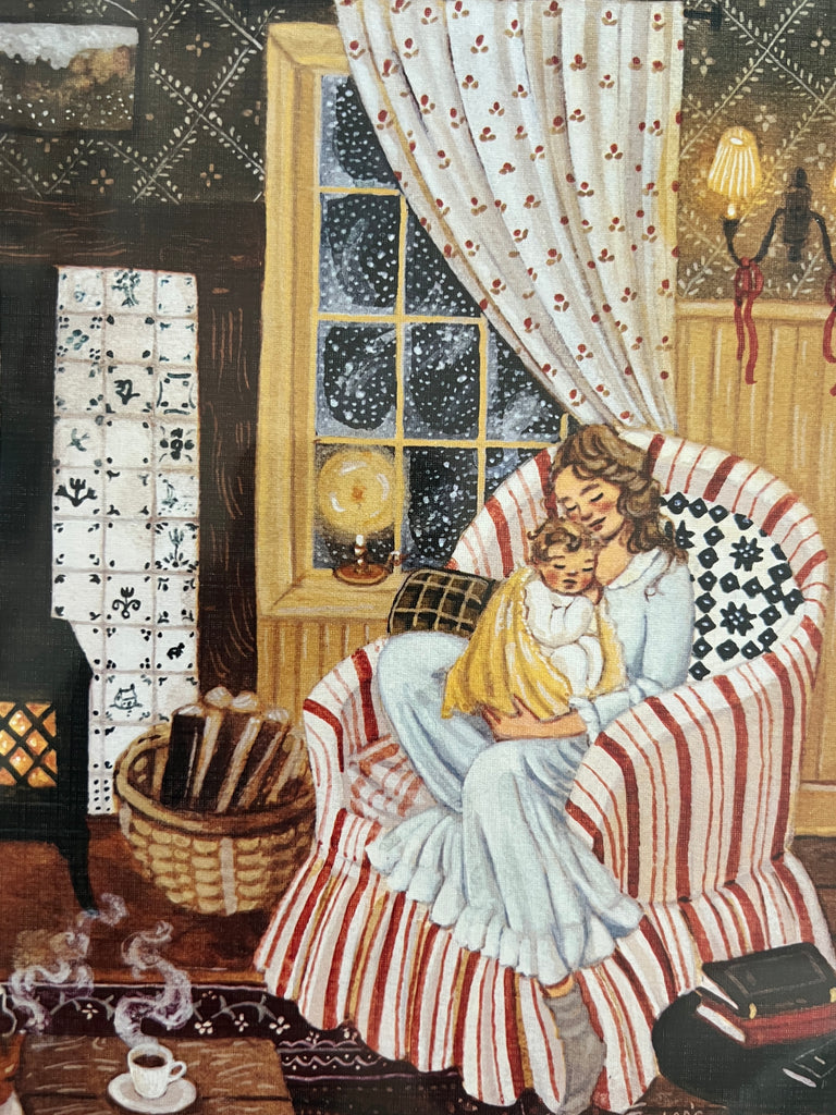 This 500 piece puzzle captures a young mother cradling her infant in the soft glow of a cozy cottage, offering a serene moment of comfort, love, and connection. Original Painting by Artist Loré Pemberton.