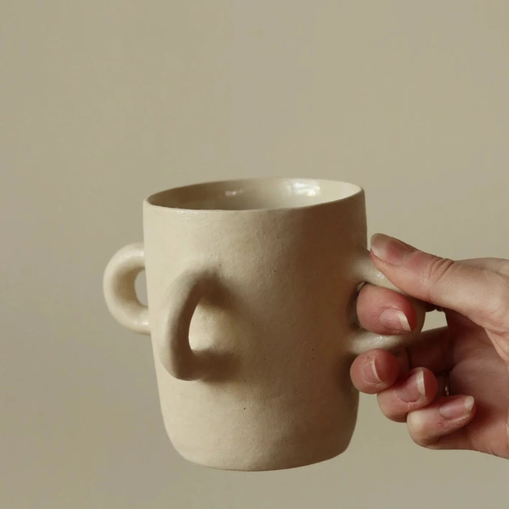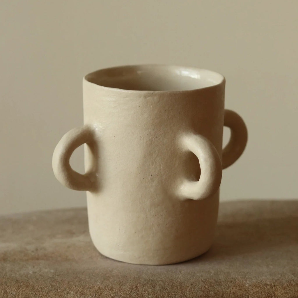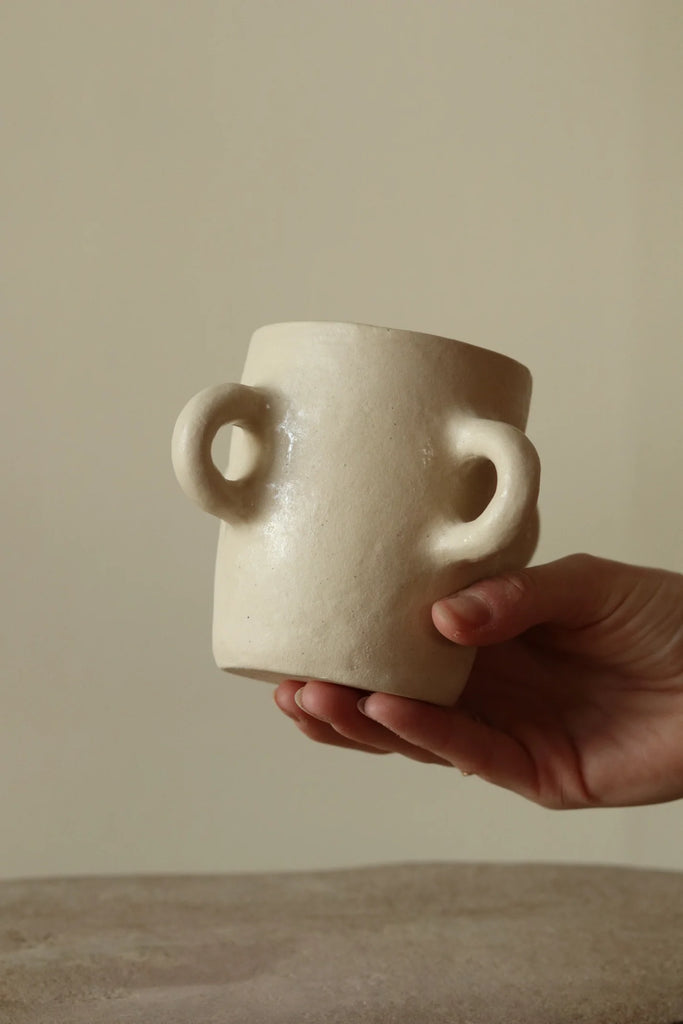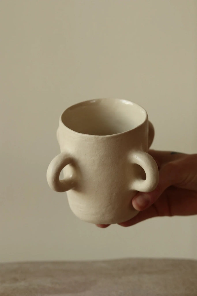 MannaMug made by hand from an off white clay. Featuring four small handles. The interior has a clear glaze, and the exterior has been glazed with a sea sponge. Inspired by ancient forms & imbued with soul.