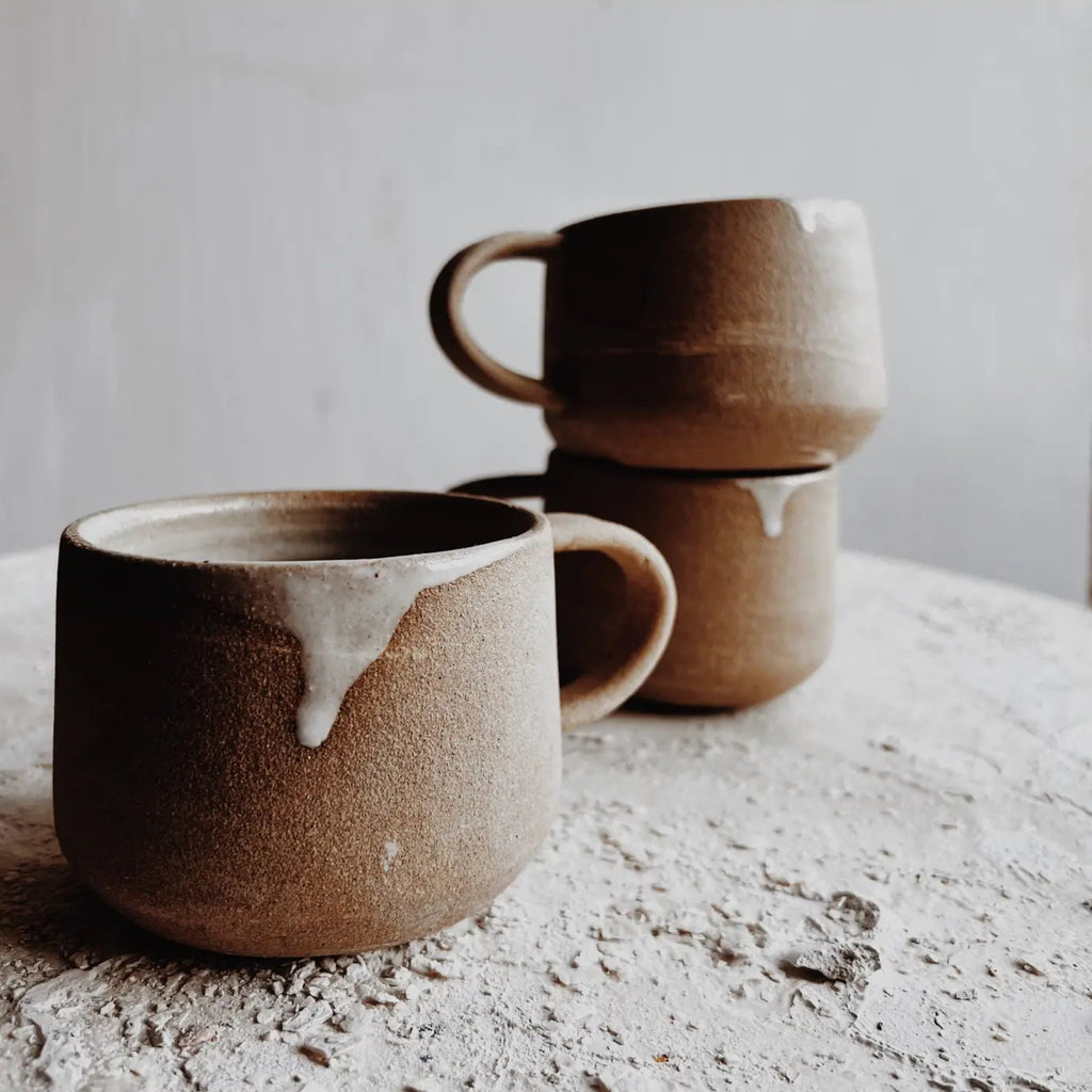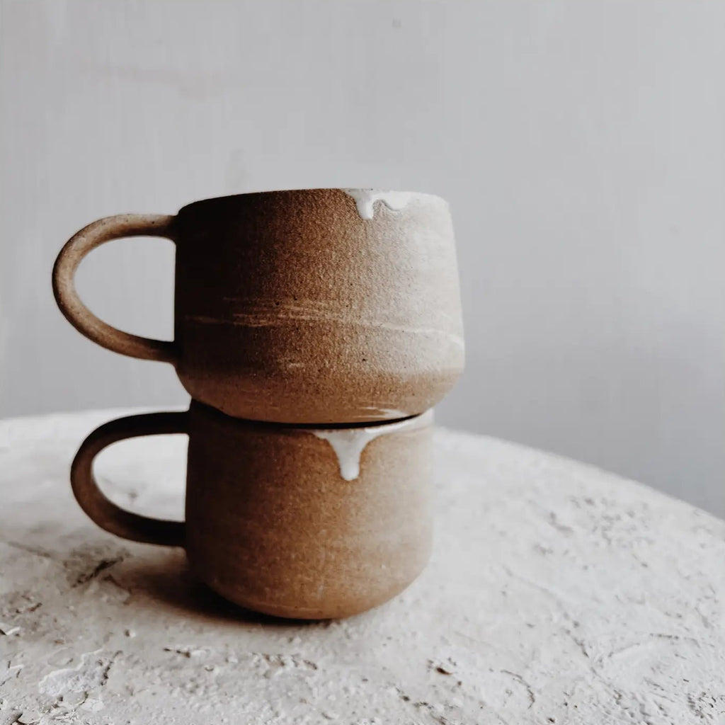 MannaRaw Dune clay with a glazed white interior. Each mug will vary in exterior glaze finish. Clear glazed with a splash of bright white. Non-Toxic and Lead-free. 12 oz.