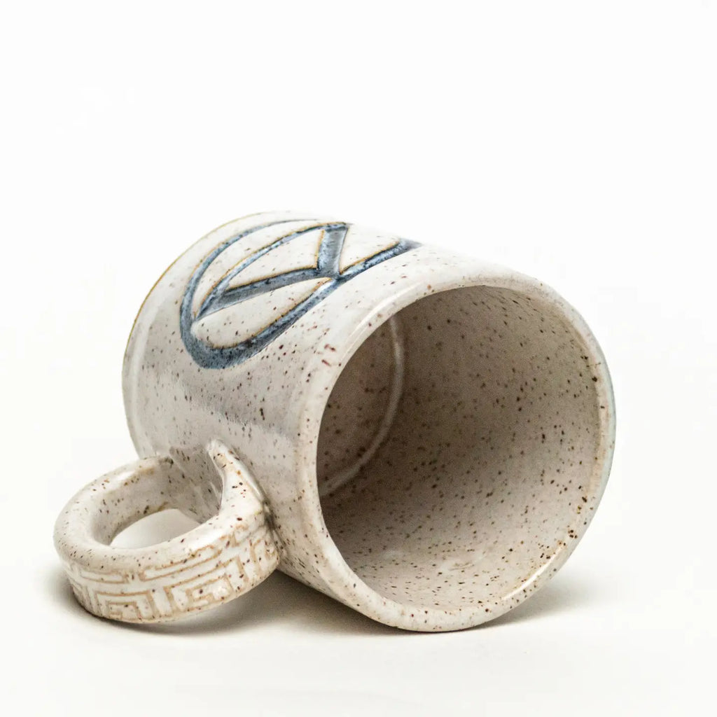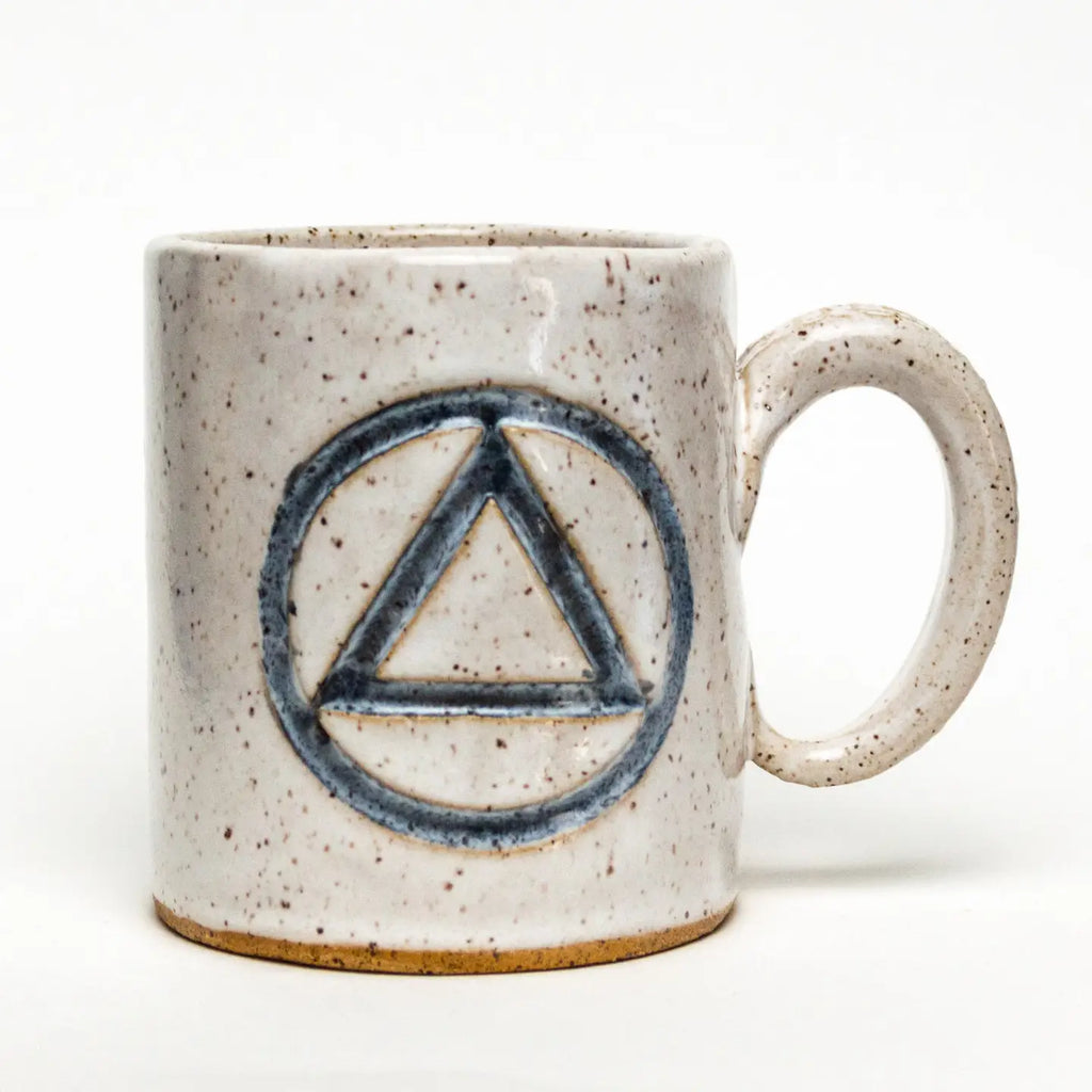 MannaHandmade ivory mug with the sobriety symbol formed into it, approximately 12 oz. This mug is hand-built and hand-glazed. Food, dishwasher, and microwave safe. Due to the handmade nature, size, shape and colors may slightly vary.