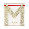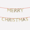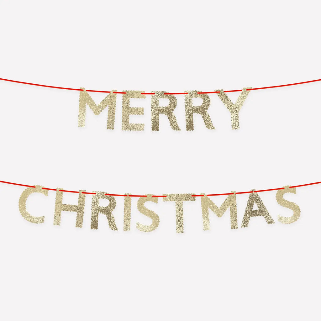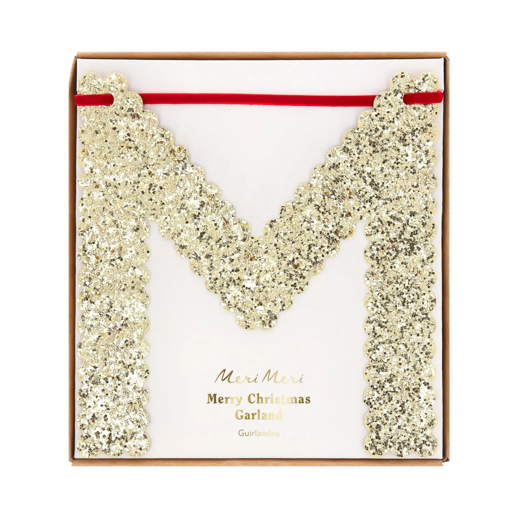 MannaIncludes two paper garlands, one with pennants spelling 'Merry' and the other spelling 'Christmas'. Chunky platinum gold glitter on the front and shiny gold foil on the reverse with scalloped edge details. Red velvet ribbon.