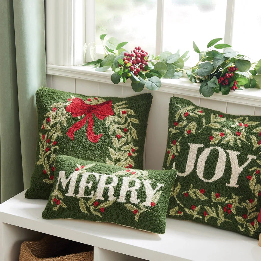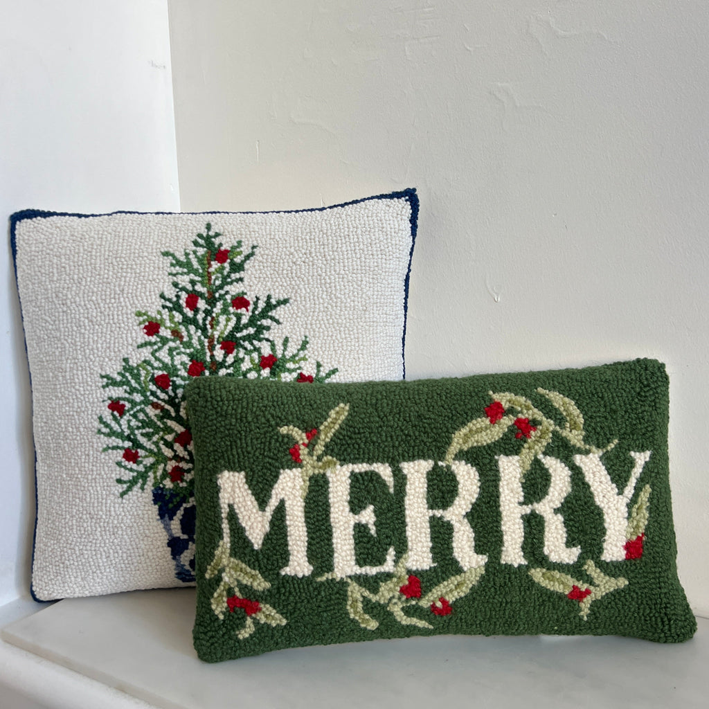 Holiday 'Merry' Hook Pillow. Handmade with 100% wool and poly velvet.