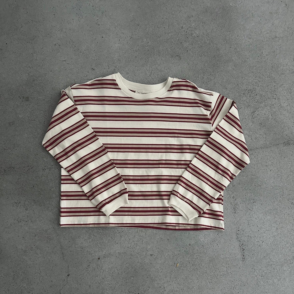 Knit cotton multicolor stripe crew neck long sleeve top.