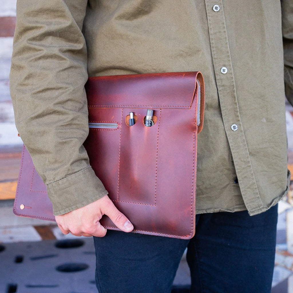 Handmade out of top-grain leather with a wool lined interior, this Leather Laptop Case provides rugged protection for your laptop. It also has additional pockets for small frequently used items such as your phone and a small notebook. It's a sleek and minimal sleeve that is sure to protect and impress.