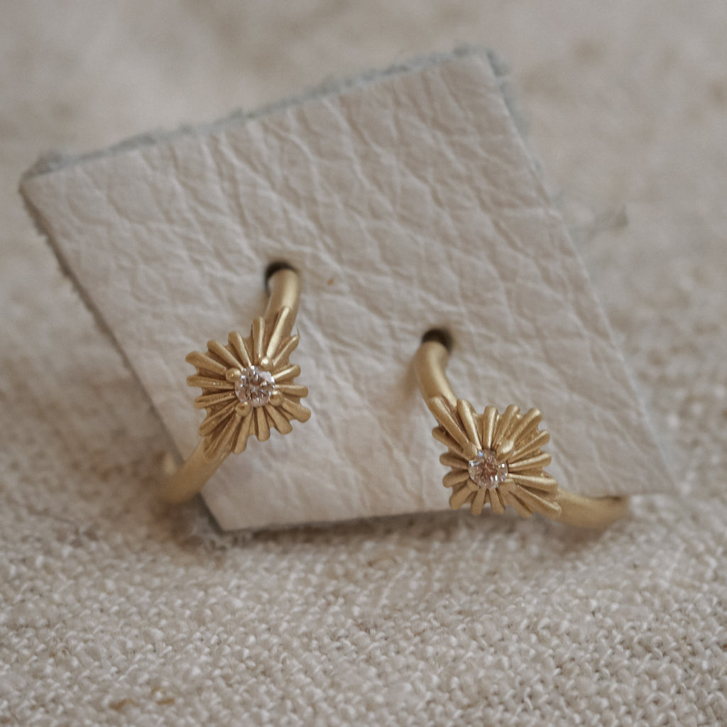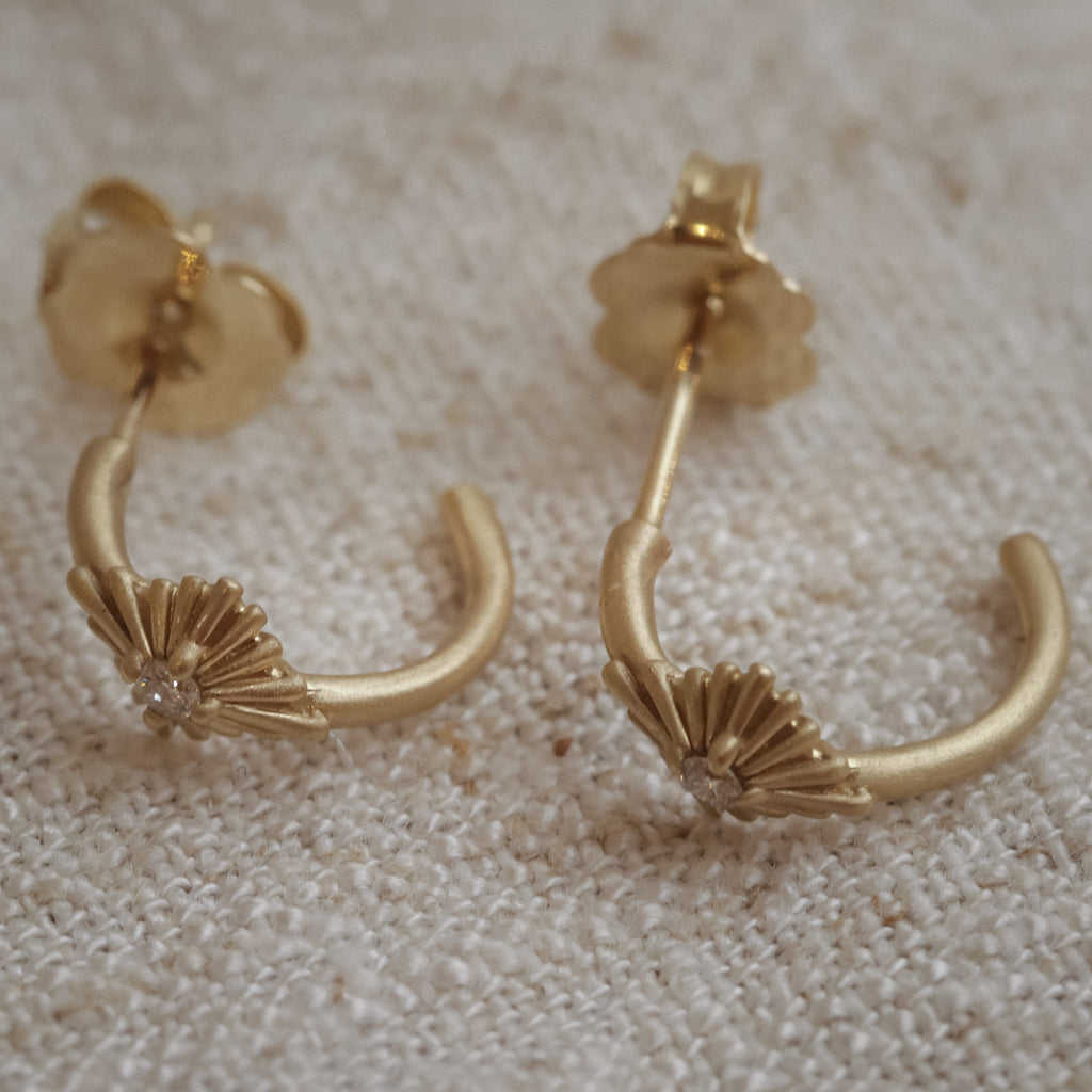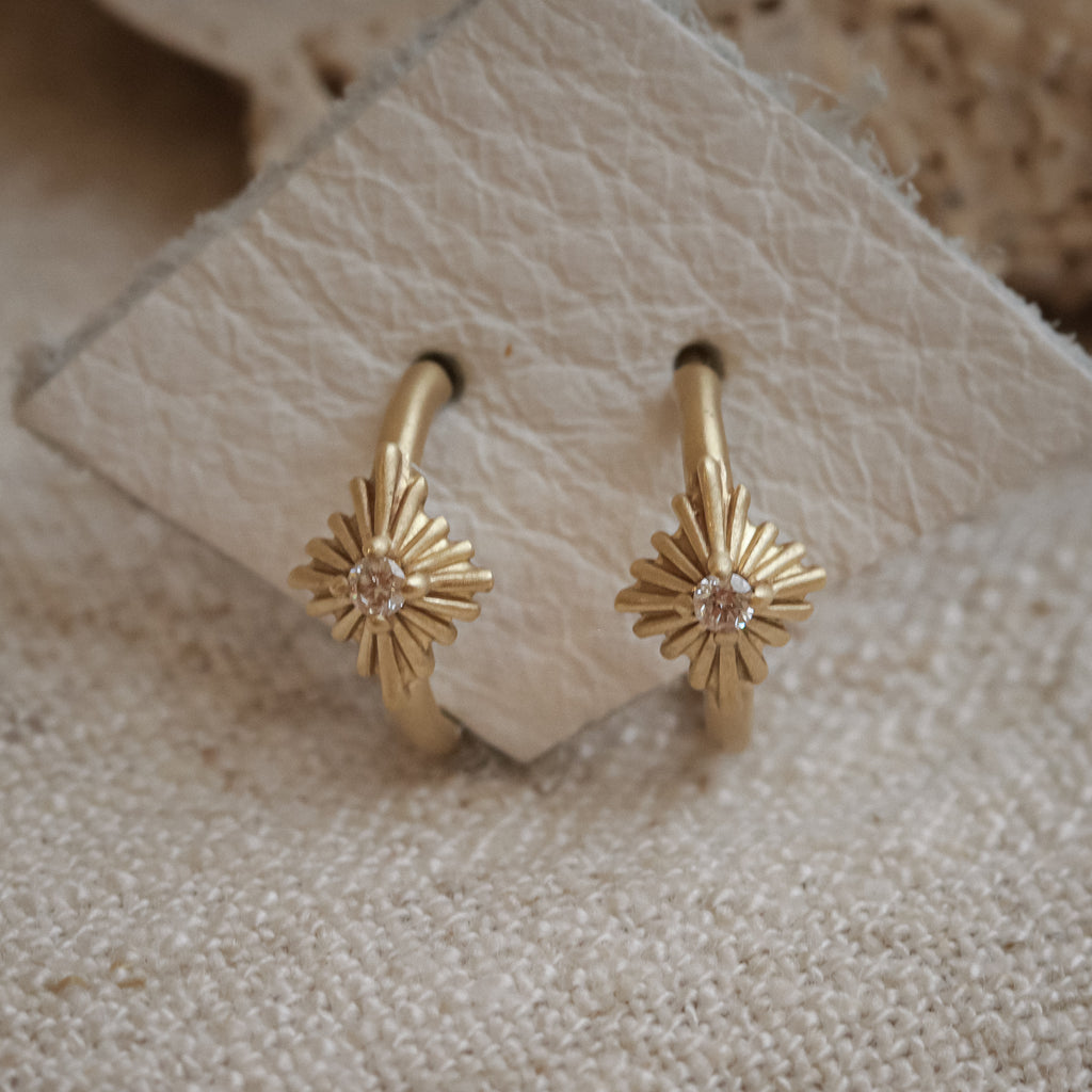 MannaSolid gold hoop earrings featuring a sunburst design, with a petite diamond (1.5mm) in the center. 14k Karat solid gold. Sold as a pair.