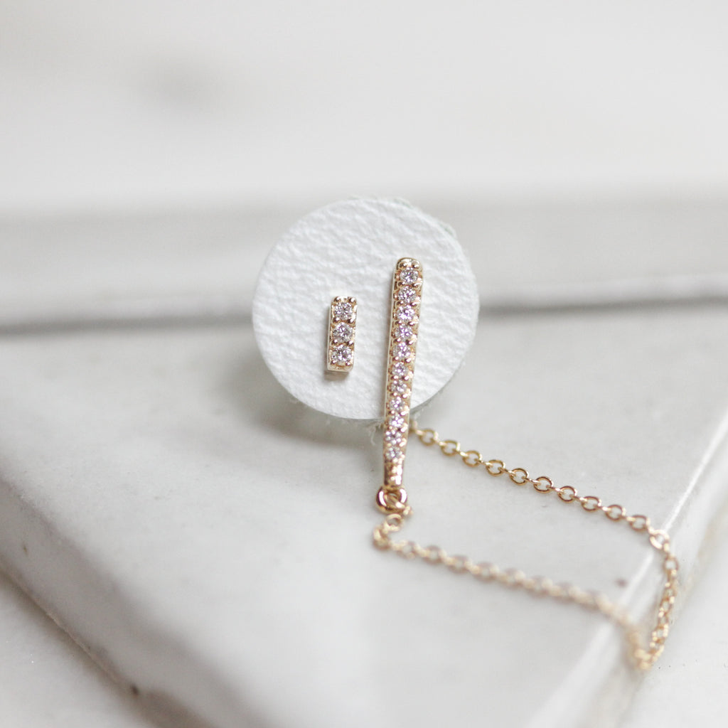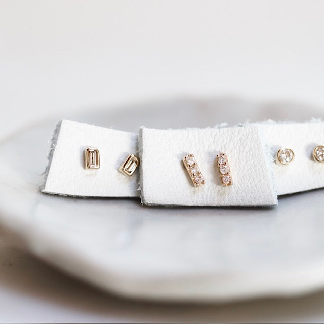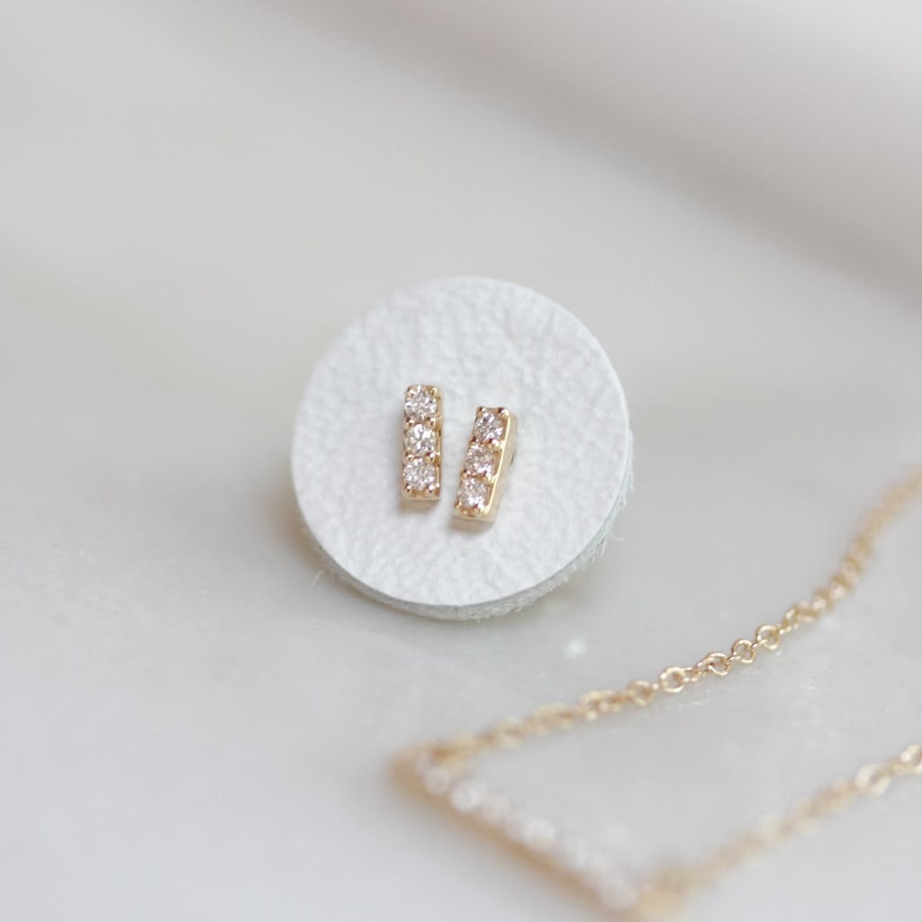 Manna3 white Diamonds (1.2mm with the option of sustainably grown or ethically mined) in solid, 14 karat gold create a brilliant bar earring.