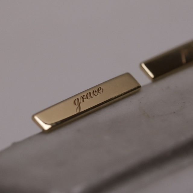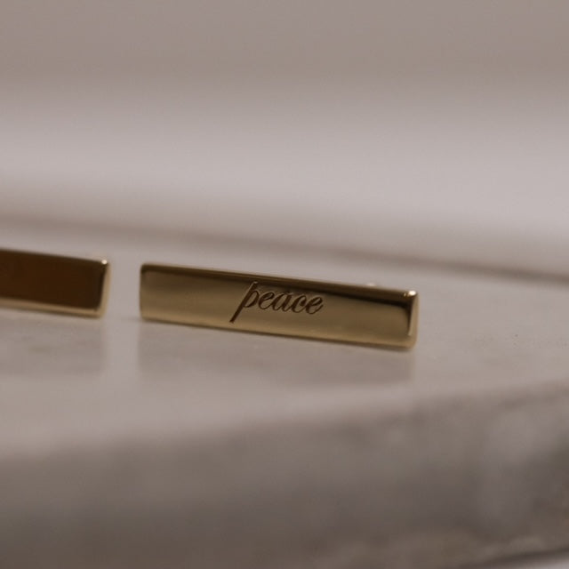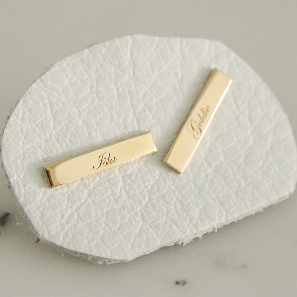 MannaSolid 14k gold engraved bar earrings. Customize with one of the lovely given options or custom engrave with the words of your choosing. Perfect for celebrating birthdays, anniversaries and showers. Sold as a pair.