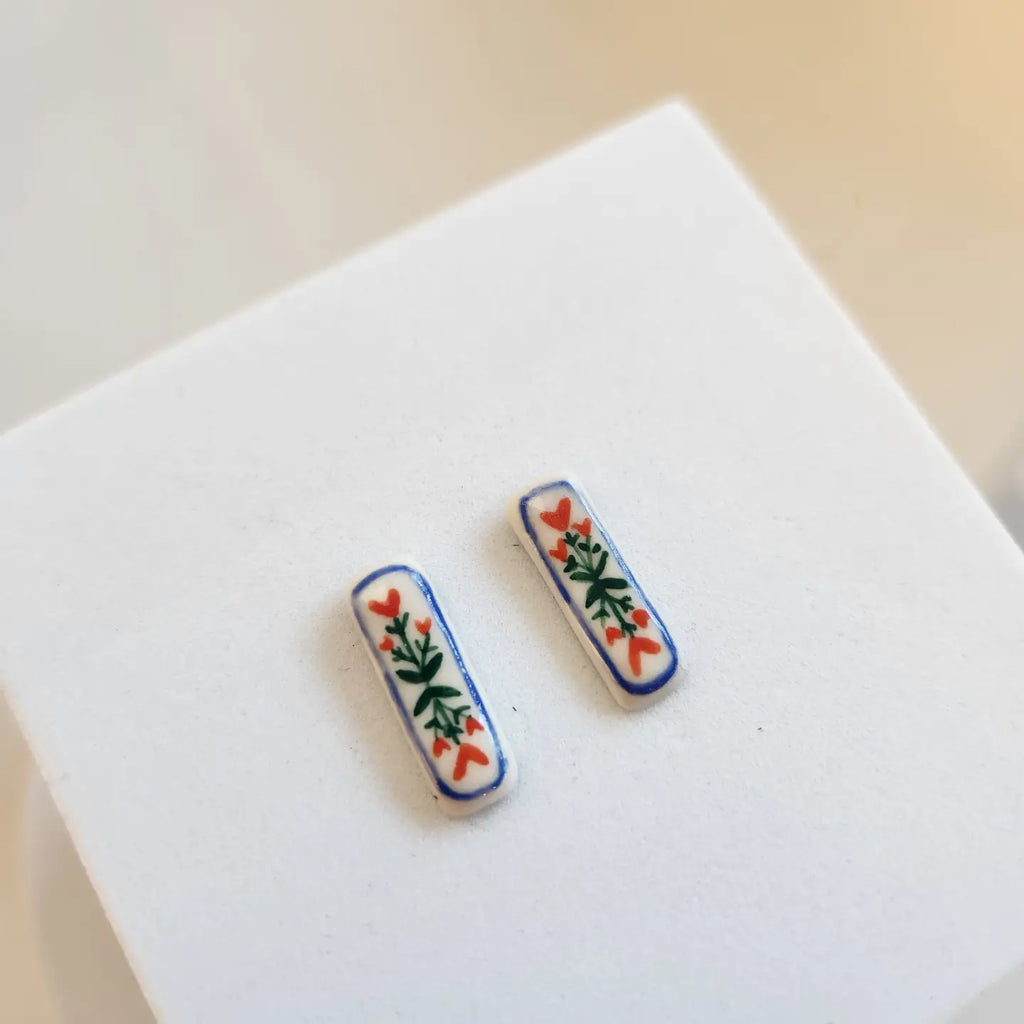 Hand painted porcelain ceramic stud earrings. Post is stainless steel. Patterns will vary from photo. Earrings measure 1” in length.