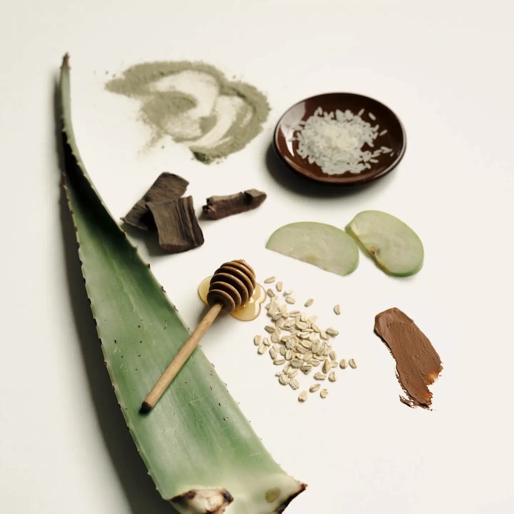 Ingredients: Rice (Oryza sativa) * Apple (Malus domestica) * Aloe (Aloe barbadensis leaf juice) * Gotu Kola (Centella asiatica) * Matcha (Camellia sinensis) * Rhassoul ** Oat (Avena sativa) * Arjuna Bark (Terminalia arjuna) * Neem (Azadirachta indica) * Honey (Honey & Maltodextrin) ** * Certified Organic.