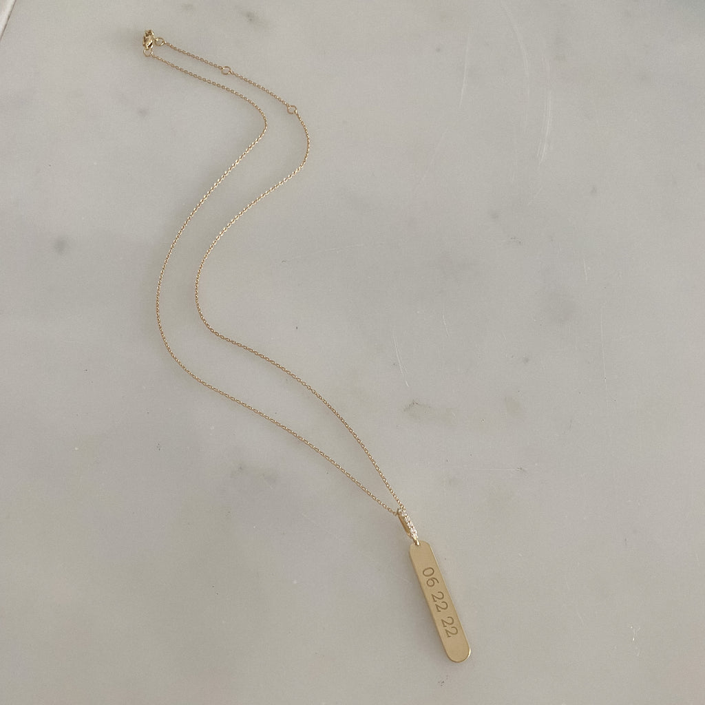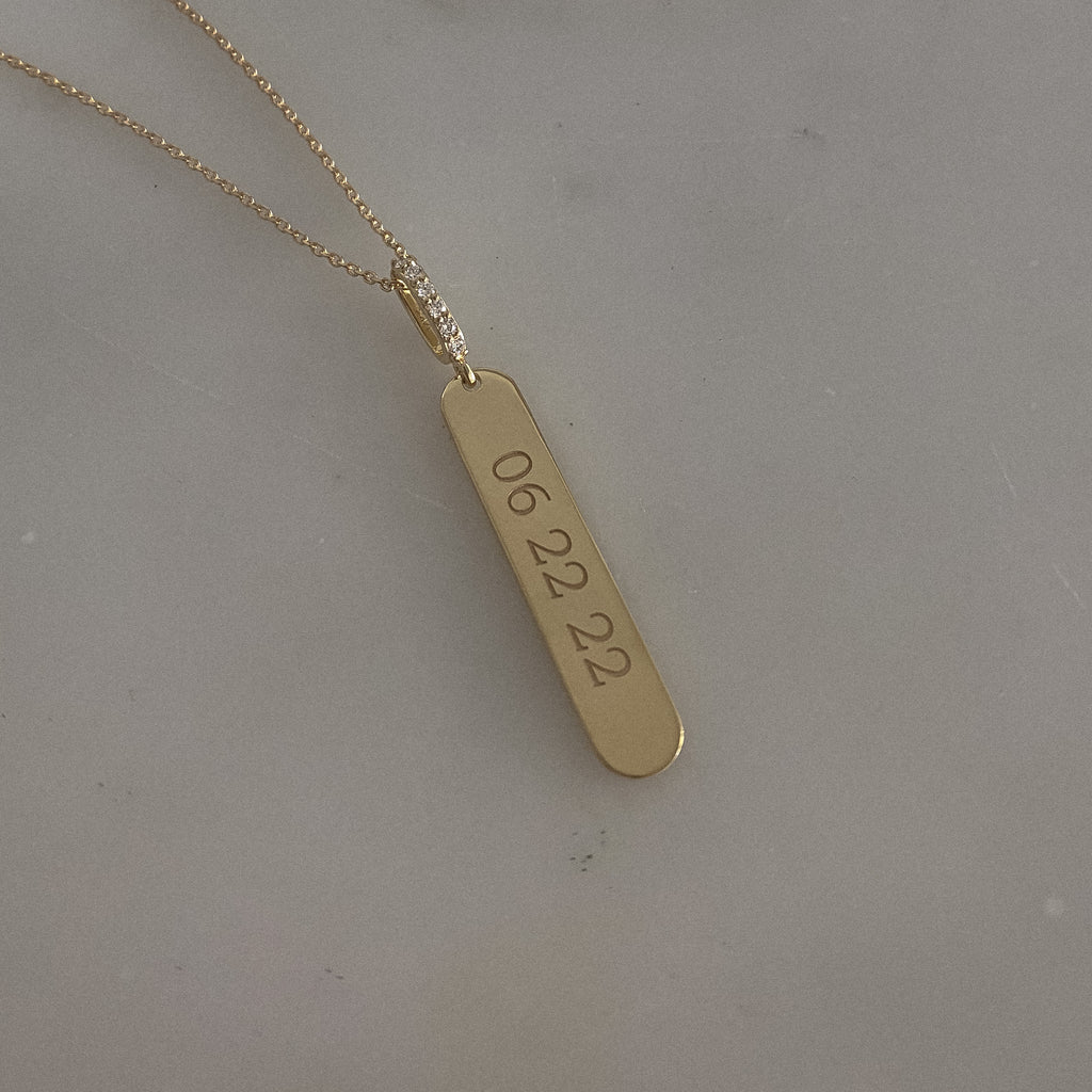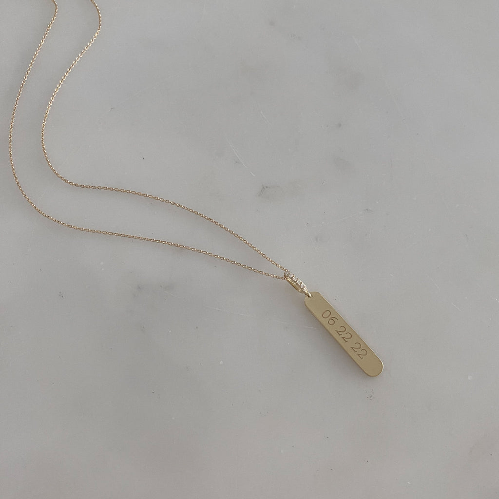 MannaA brilliant diamond loop holds a substantial, 14k gold message bar and rests along an adjustable, 16"-18" solid gold chain. A beautiful, future heirloom piece.