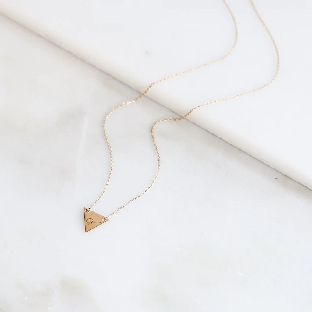 MannaA solid 14K 35mm triangle pendant is custom engraved and hangs from a solid 14K gold 18" chain. Customize with the initial of a loved one, or special number or letter. Perfect for celebrating birthdays, anniversaries and showers.