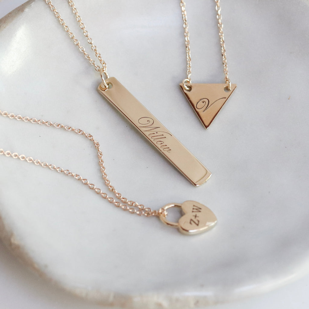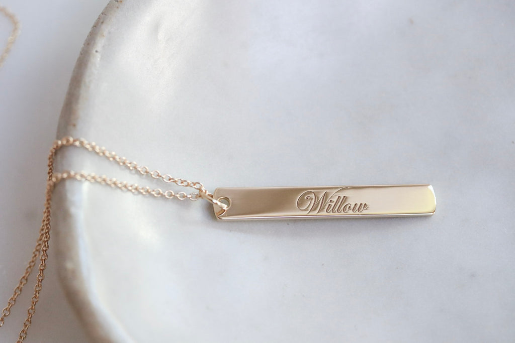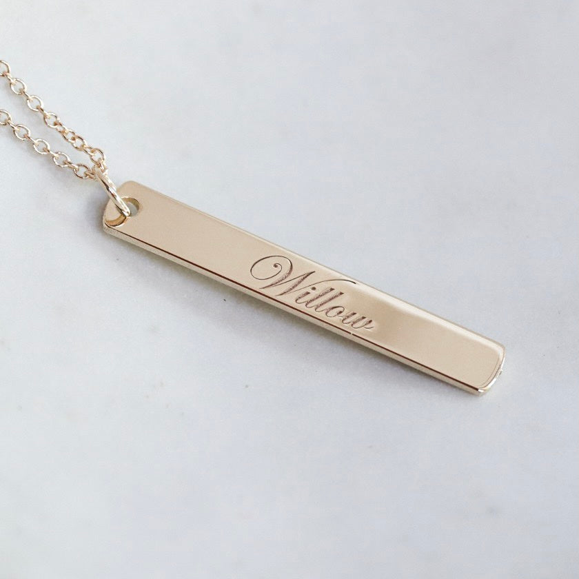 MannaA solid 14K gold vertical bar (33mm x 4.5mm) pendant is custom engraved and hangs from a solid 14K gold adjustable chain (16" - 18"). Customize with the name of a loved one, wedding date or special message. Perfect for celebrating birthdays, anniversaries and showers.