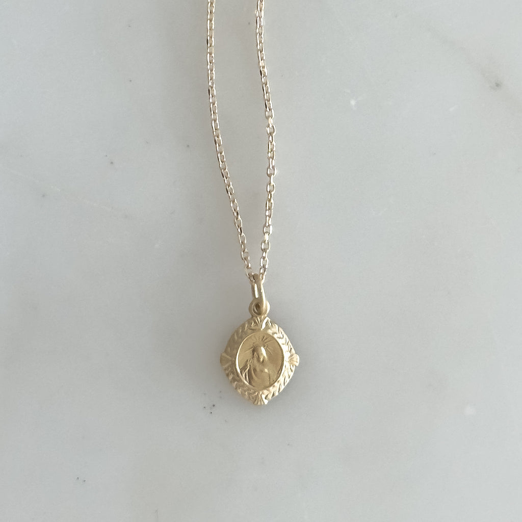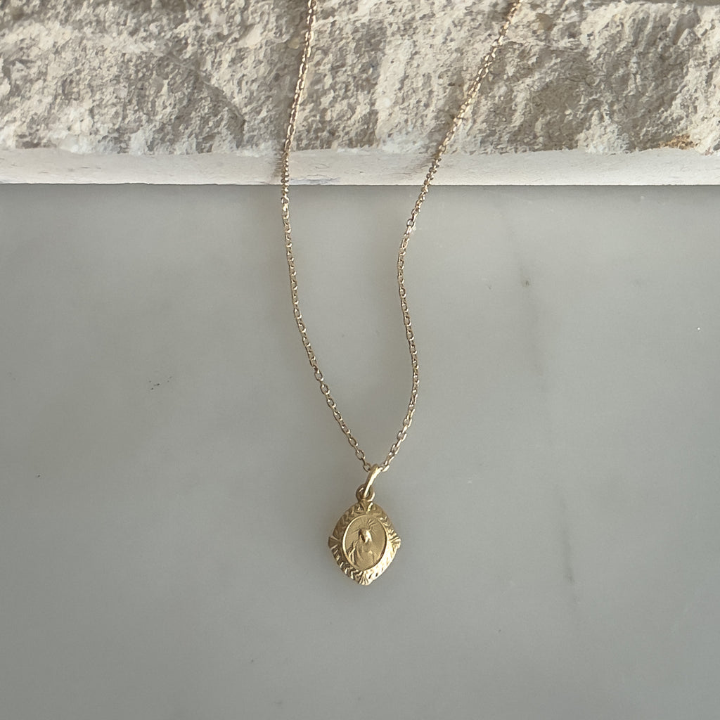 MannaA solid 14 karat gold, sacred heart pendant features the subtle image of Jesus Christ, and hangs on a 14 karat gold, adjustable 16" - 18" chain. Each pendant is hand brushed, creating a beautiful, soft matte finish.