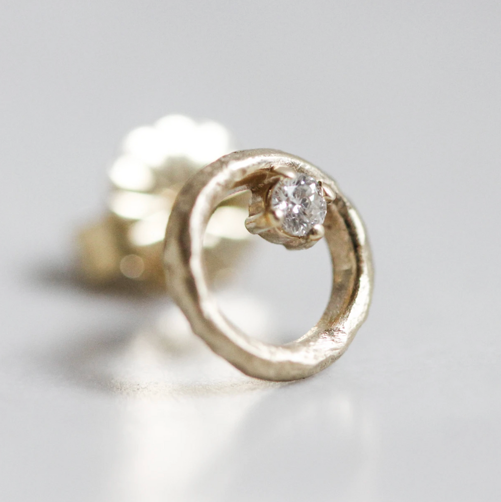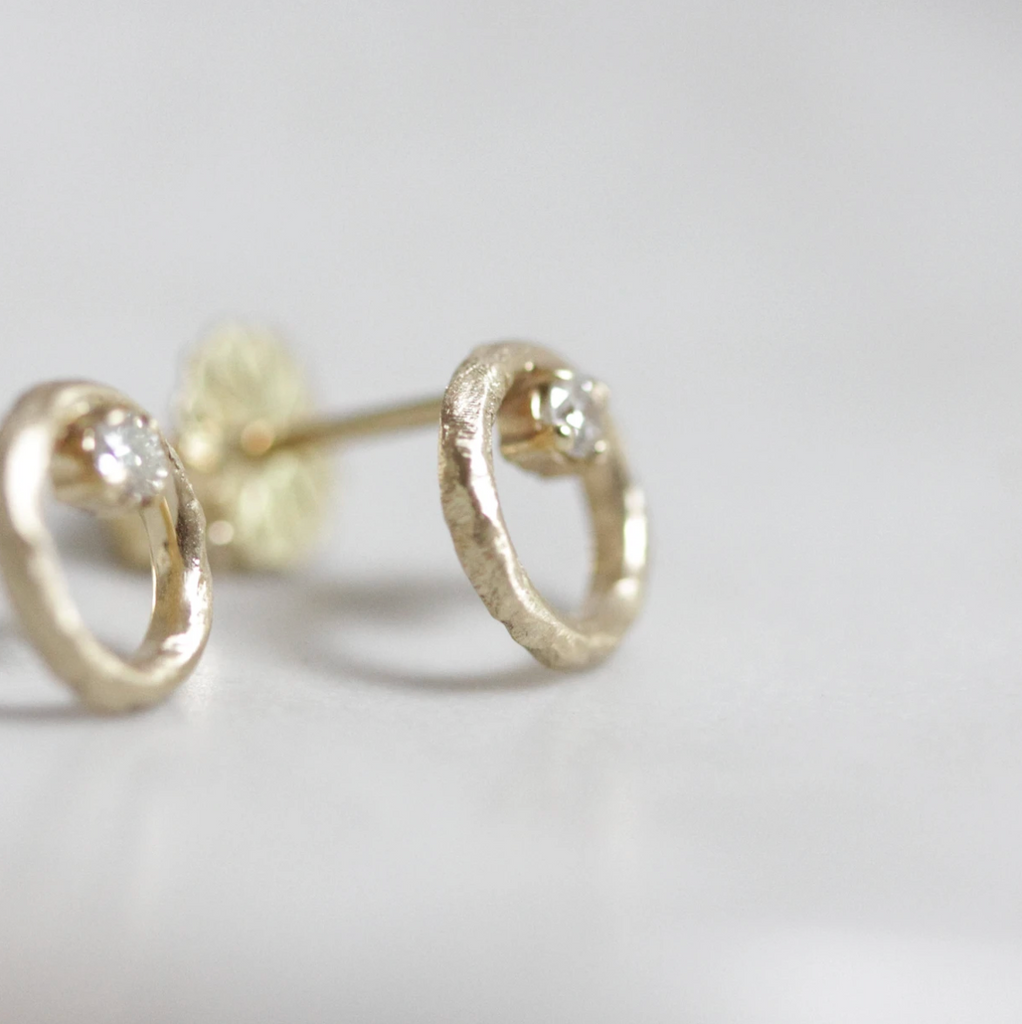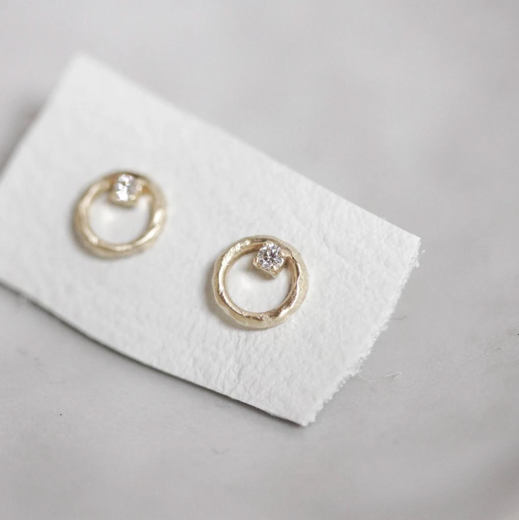 MannaThe beloved Circle Diamond Earrings. Organically shaped, solid 14K gold circles are hand carved and softly brushed for a matte finish. Each sphere holds a .03 carat, brilliant diamond. Post backs. Every pair one of a kind due to their hand forged nature.