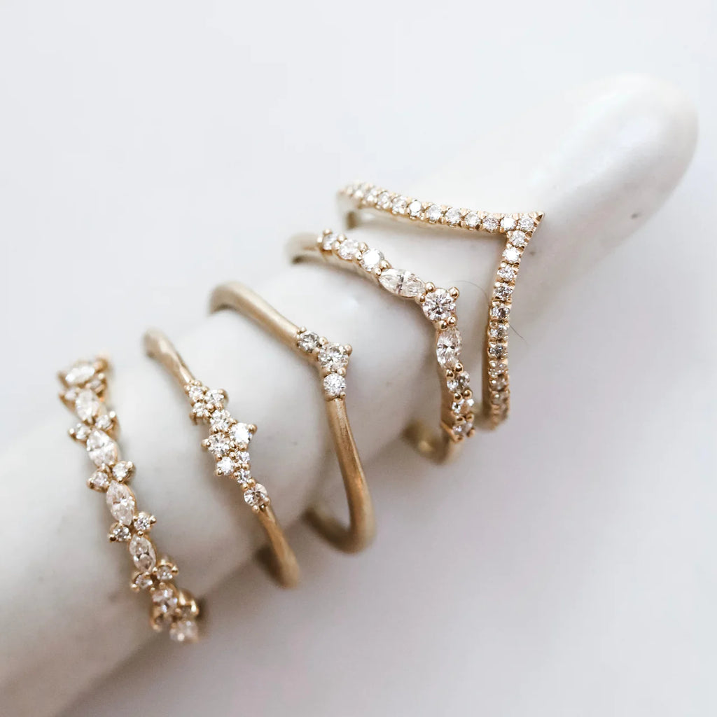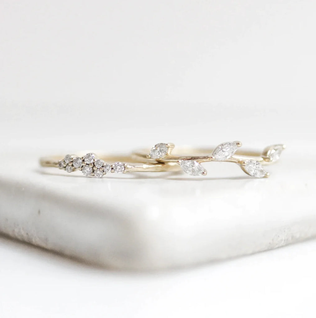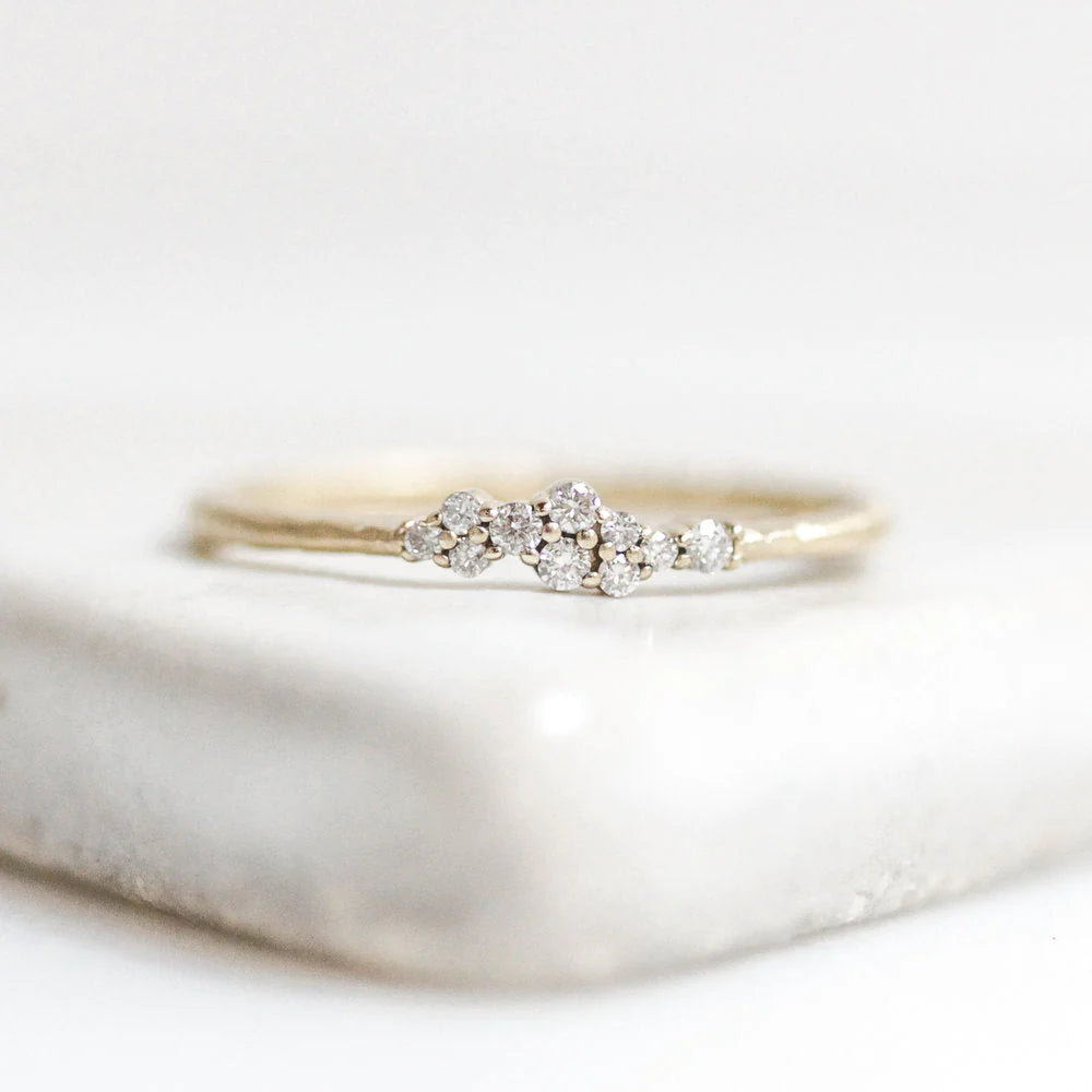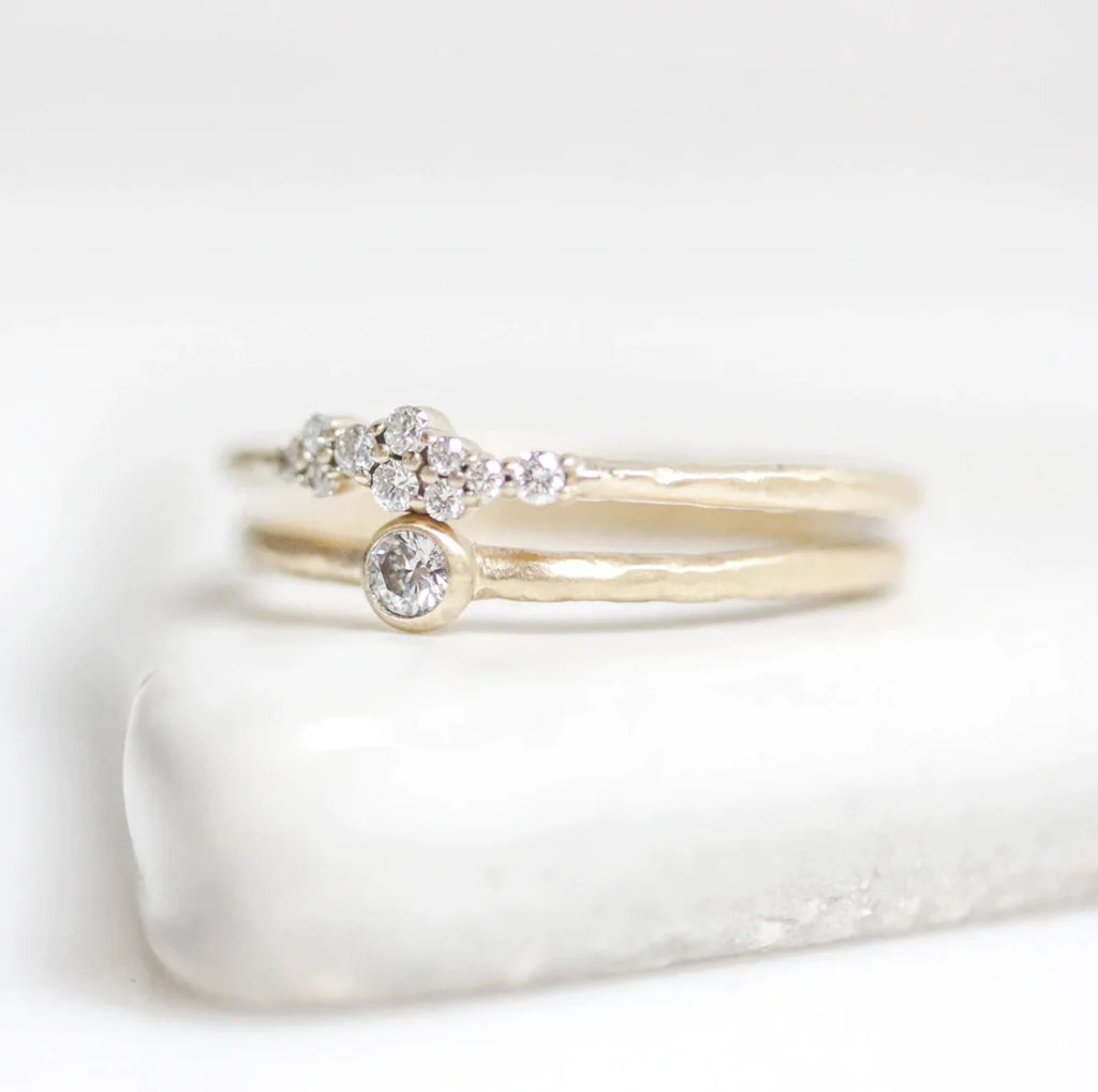 MannaA beautiful cluster of petite diamonds is nestled within your choice of a hand carved, organic gold band or a smooth and sleek gold band. Solid 14 karat.