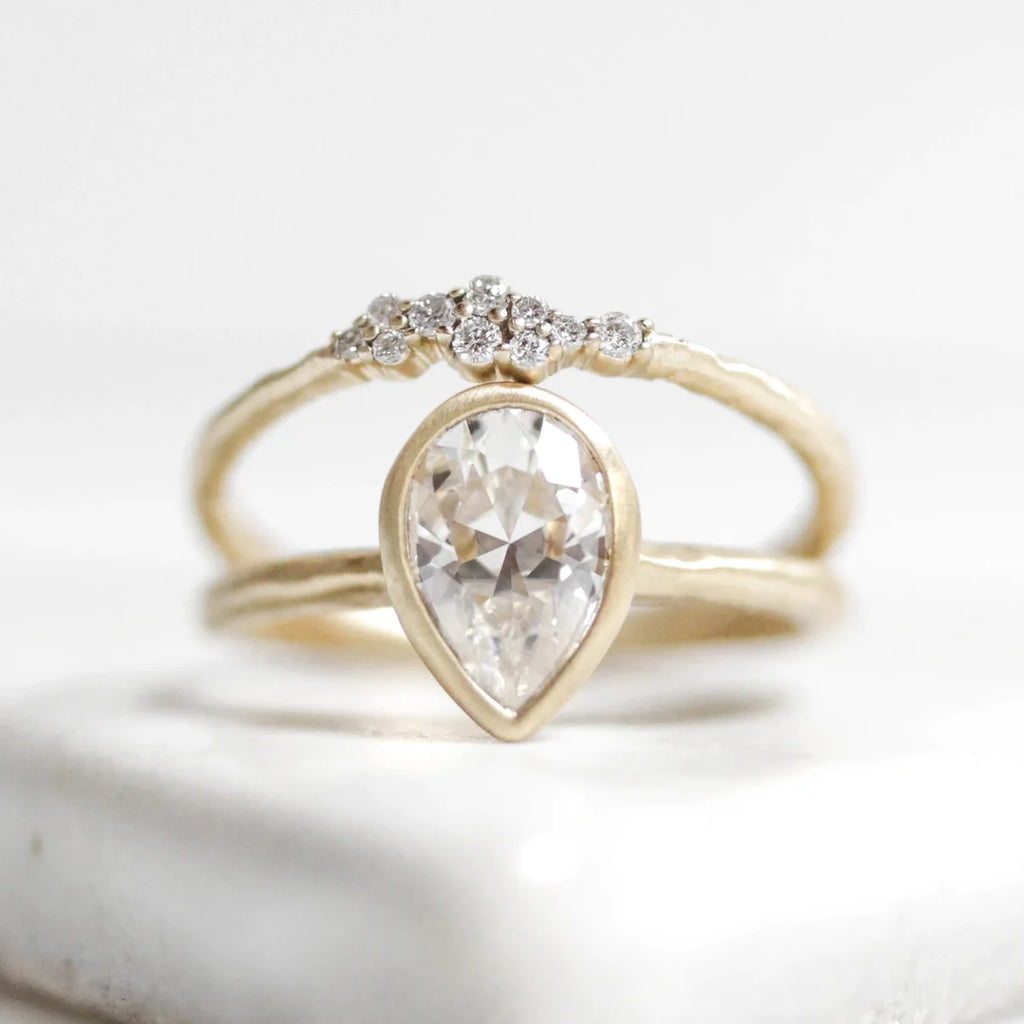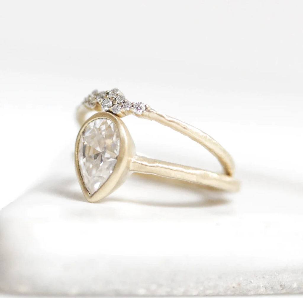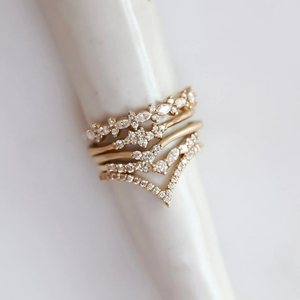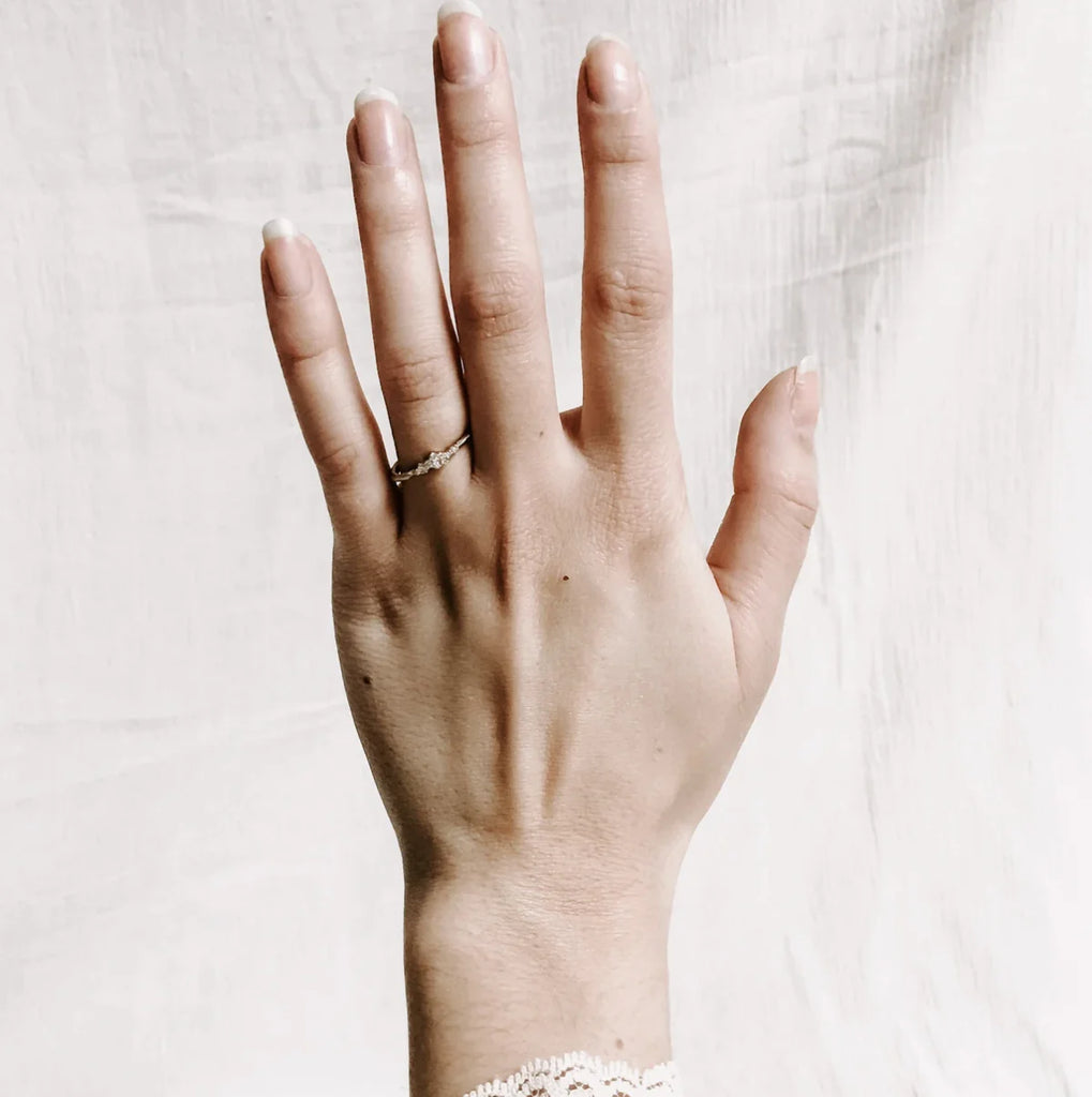 MannaA beautiful cluster of petite diamonds is nestled within your choice of a hand carved, organic gold band or a smooth and sleek gold band. Solid 14 karat.
