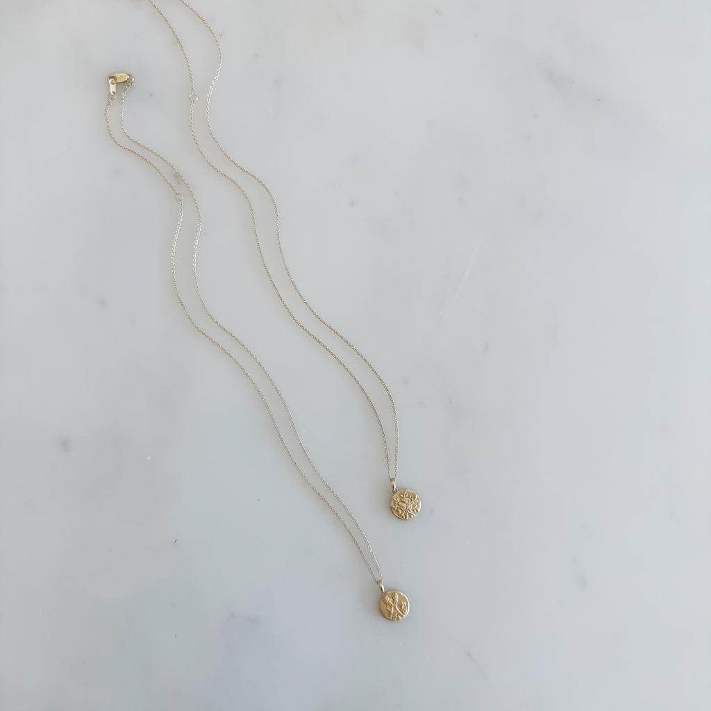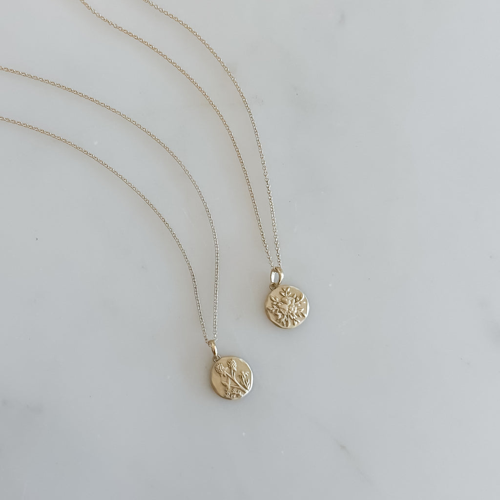 MannaA solid 14K gold, hand carved floral medallion hangs from a solid 14K gold, adjustable 16"-18" chain.