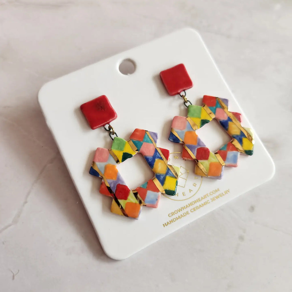 MannaHandmade and hand painted porcelain earrings with 22k gold luster accents and raw brass hardware. Post is stainless steel. Earring card measures 3x3" for size reference. Glaze patterns and colors will vary from photo due to the handmade nature.