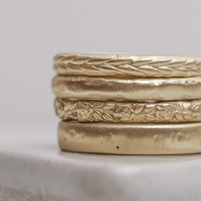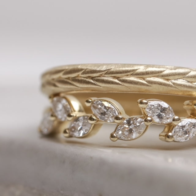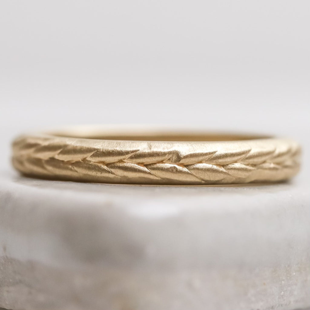 MannaSolid 14 karat carved gold features a cascading wheat/leaf design that wraps the entire band. A substantial piece on its own and beautiful as a wedding band or within a stack. Approximately 3mm wide.