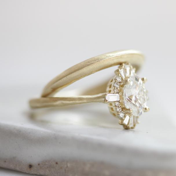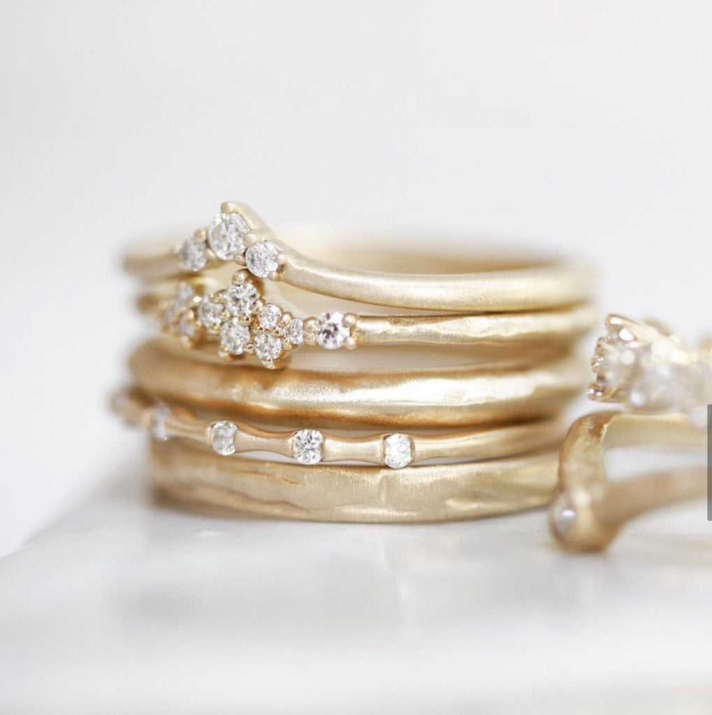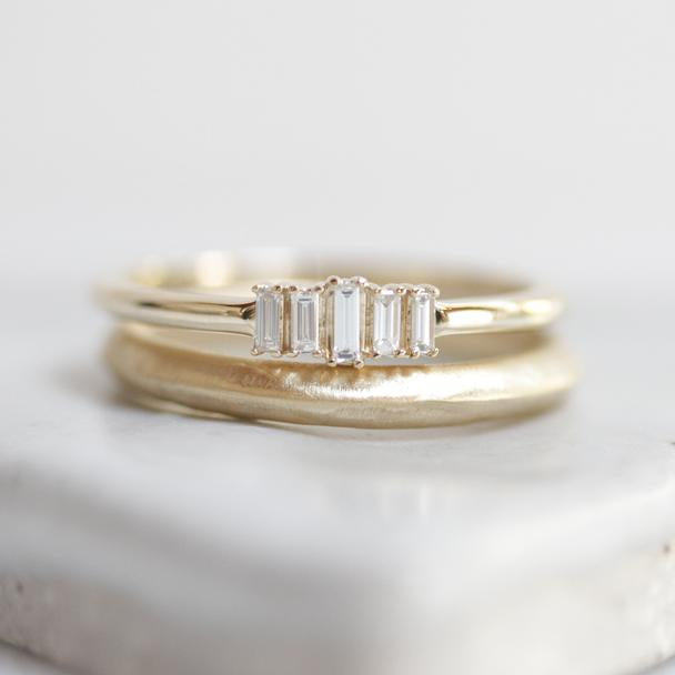 MannaSoftly carved, 14 karat gold ascends to a sharp peak. This substantial band is an instant staple and is gorgeous on its own or within a stack. Paired with an engagement ring, it beautifully highlights a more elaborate piece, while garnering affection in its own right.