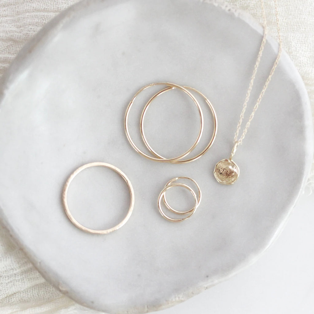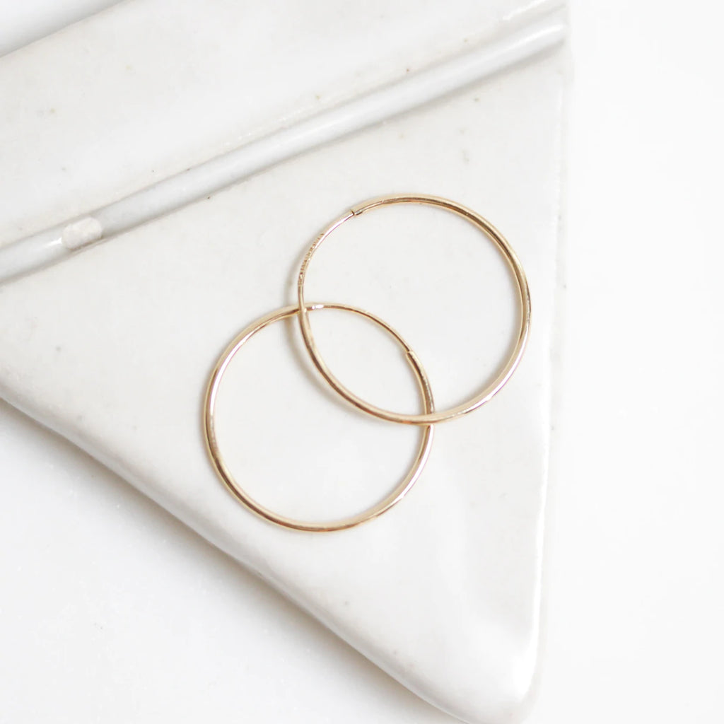 MannaComplete circles of fine, 14K yellow gold (20mm diameter). So light, you can sleep, shower and play in them, without even knowing they are there. Minimal and beautiful. Sold as a pair.