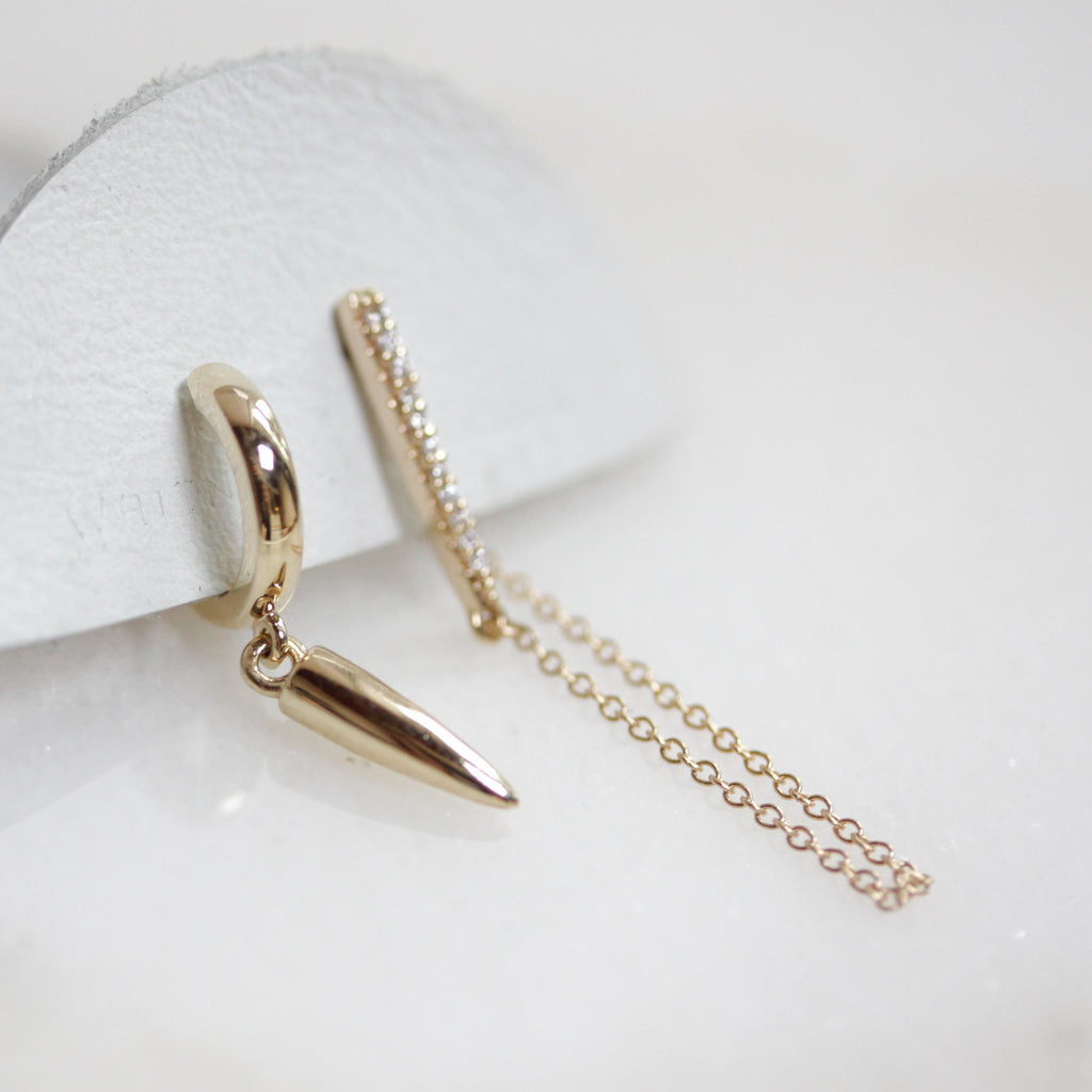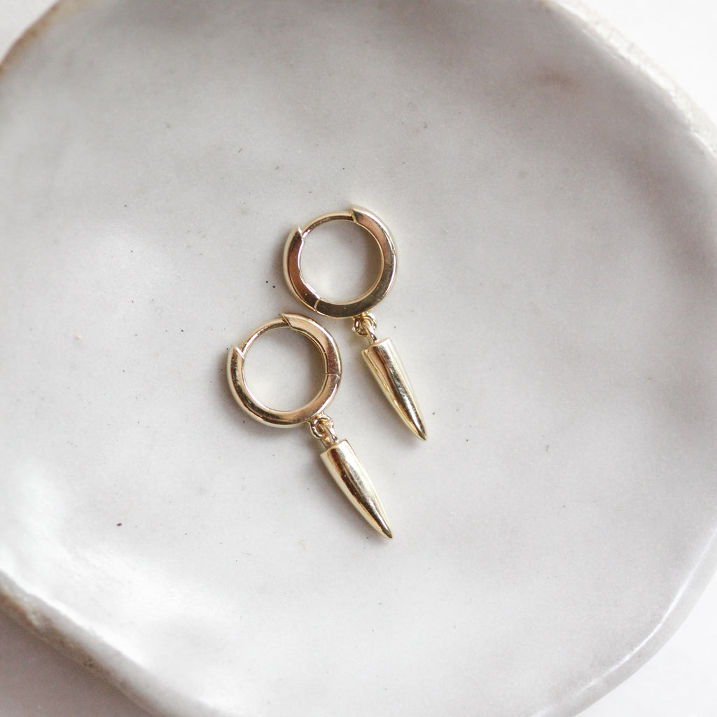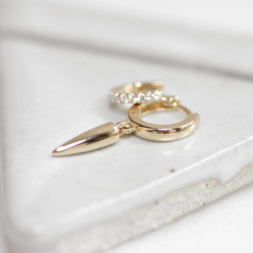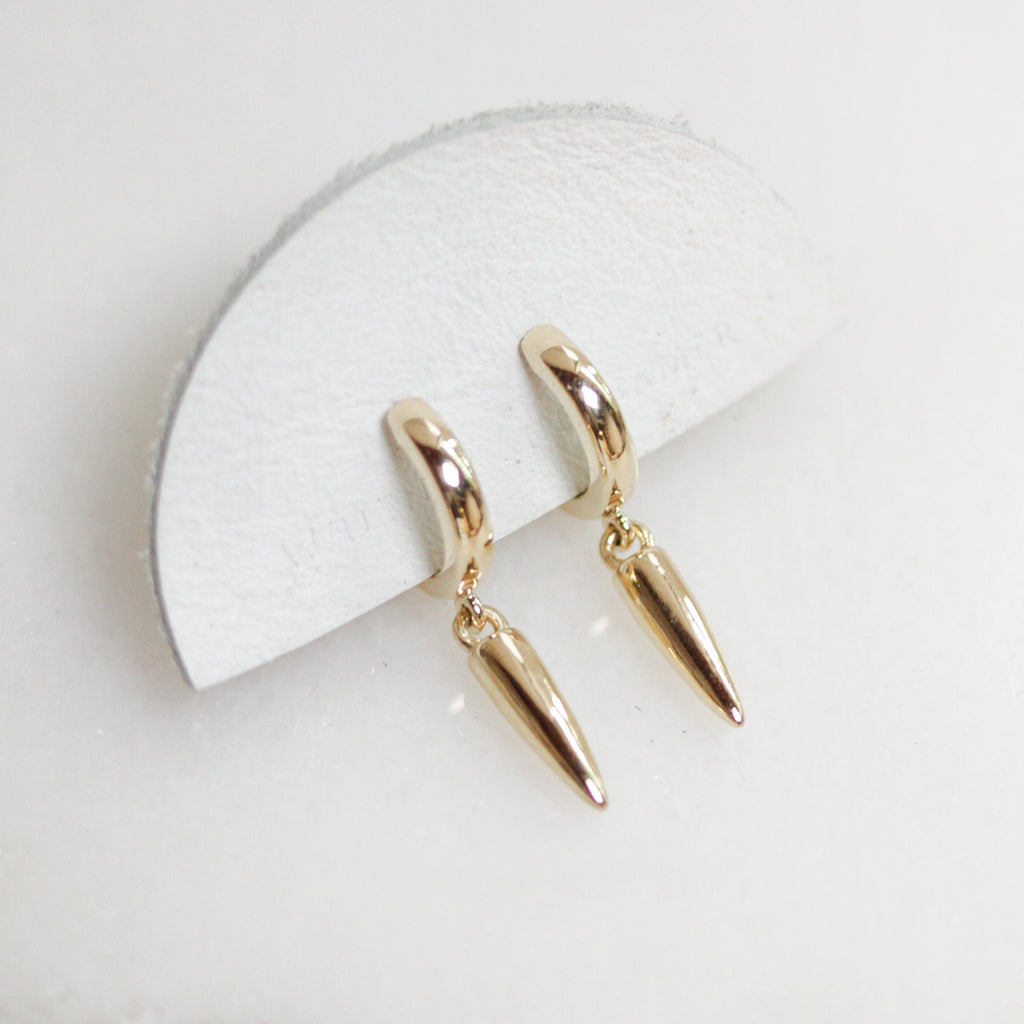 MannaThis modern set, made of solid 14 karat gold will become your go to for day and night. Thick hinged hoops and pointed drops make for an edgy and elegant staple. Sold as a pair.