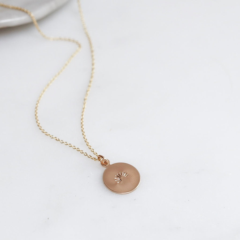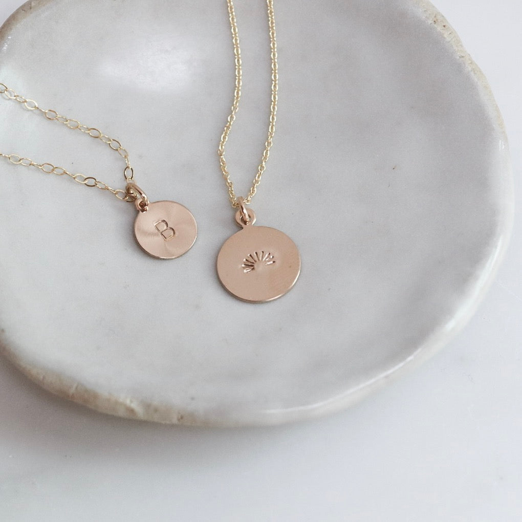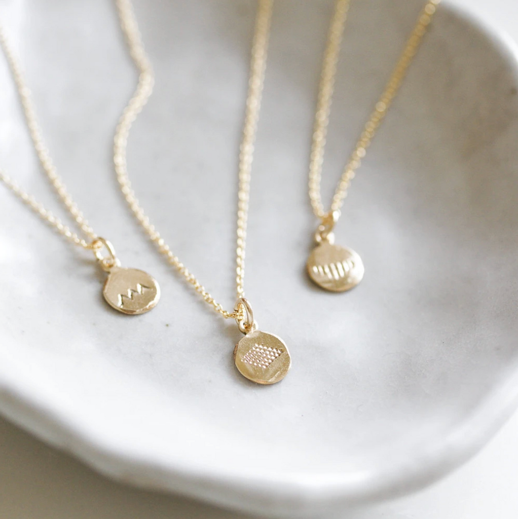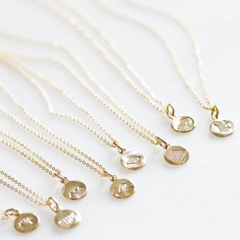 MannaThese special symbol necklaces are made for the individual (as they are sold individually), but also designed with the gift of sweet friendship in mind. A minimal and contemporary take on the BFF necklace sets (order 2, or 3 or 4 of the same symbol or different ones, for however many friends encircle you). A delicate hand stamped and hand filed, round pendant hangs from a feminine cable chain. Re-designed for 2021, gold symbols hang upon a 20" gold fill, rope chain. These necklaces layer beautifully with the Montara Necklaces, resting slightly lower on the neck with a larger charm.