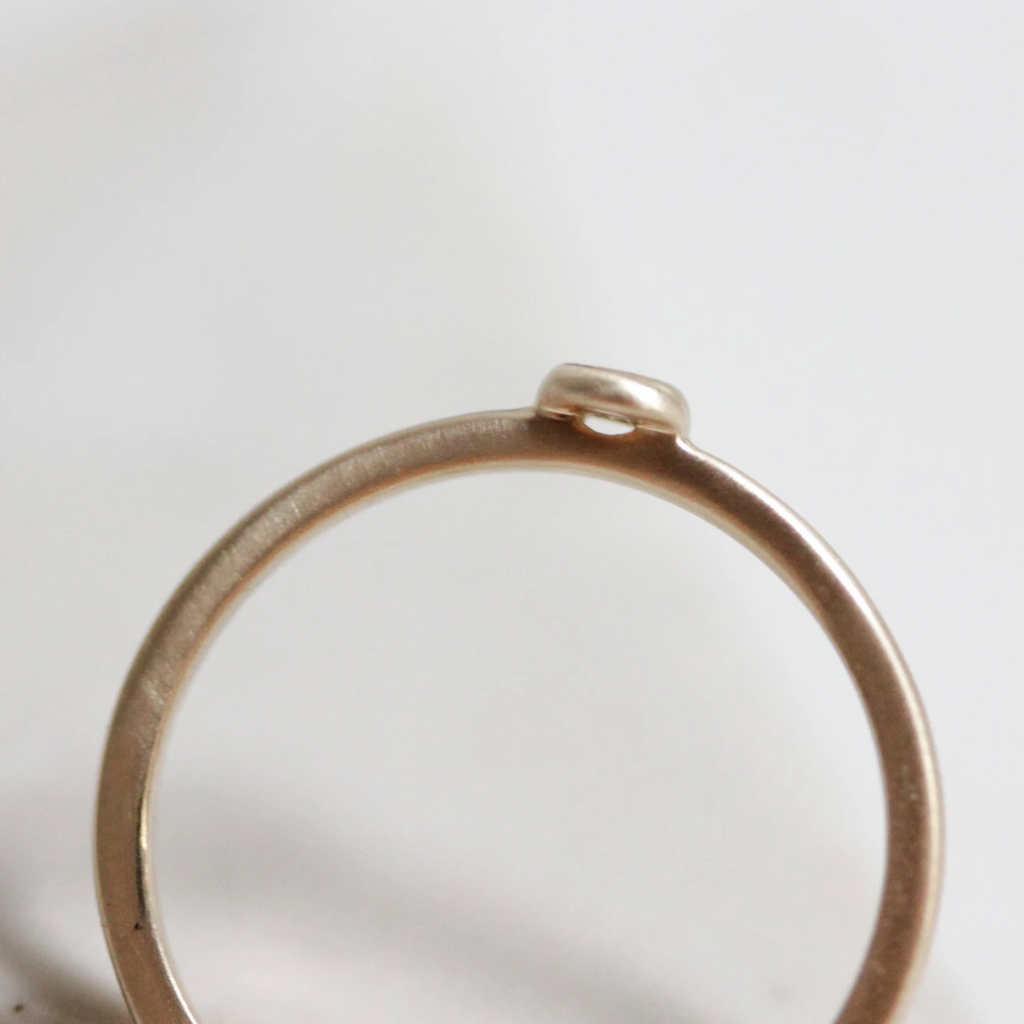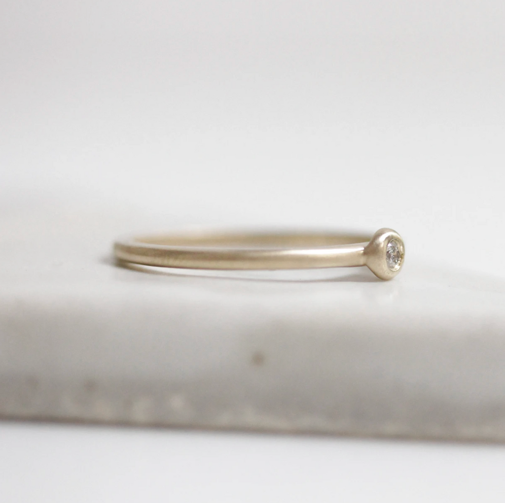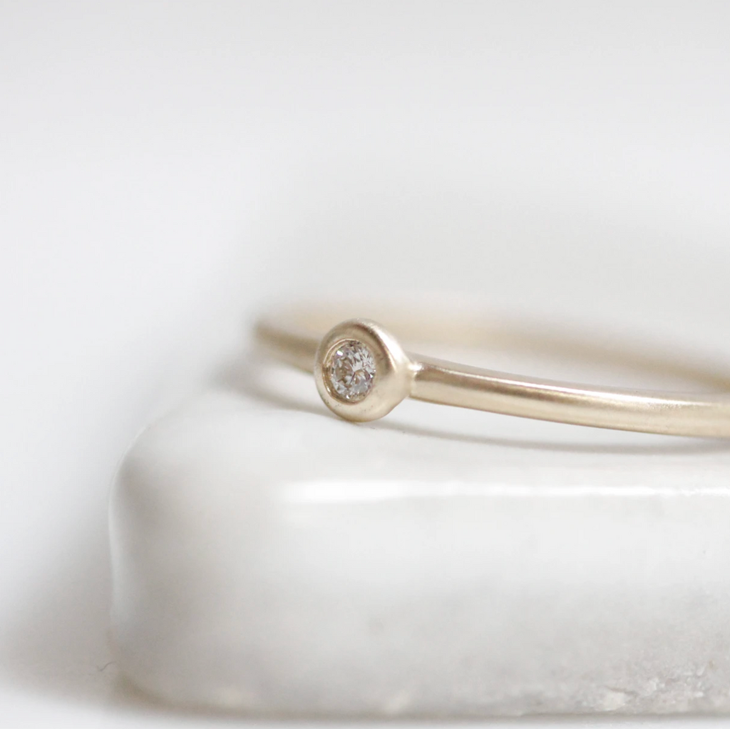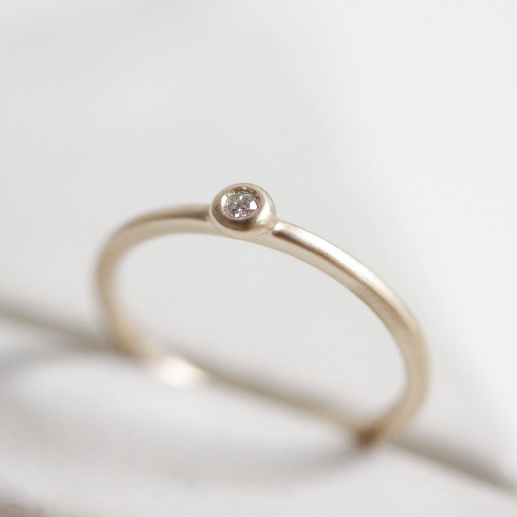 MannaIdeally sleek lines, substantial gold and light passage for ultimate sparkle. A brilliant, round, .03 carat (2mm) diamond rests within warm gold, atop a smooth band.