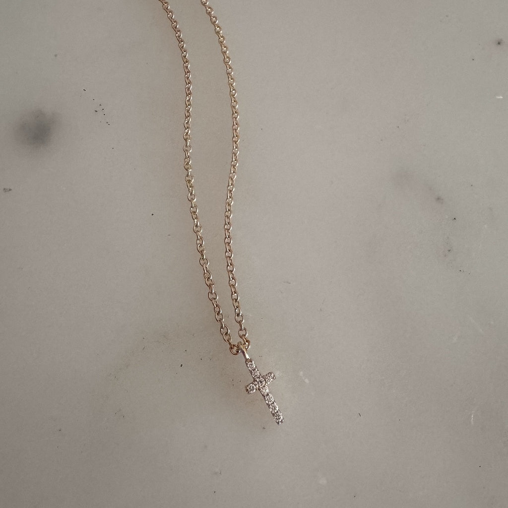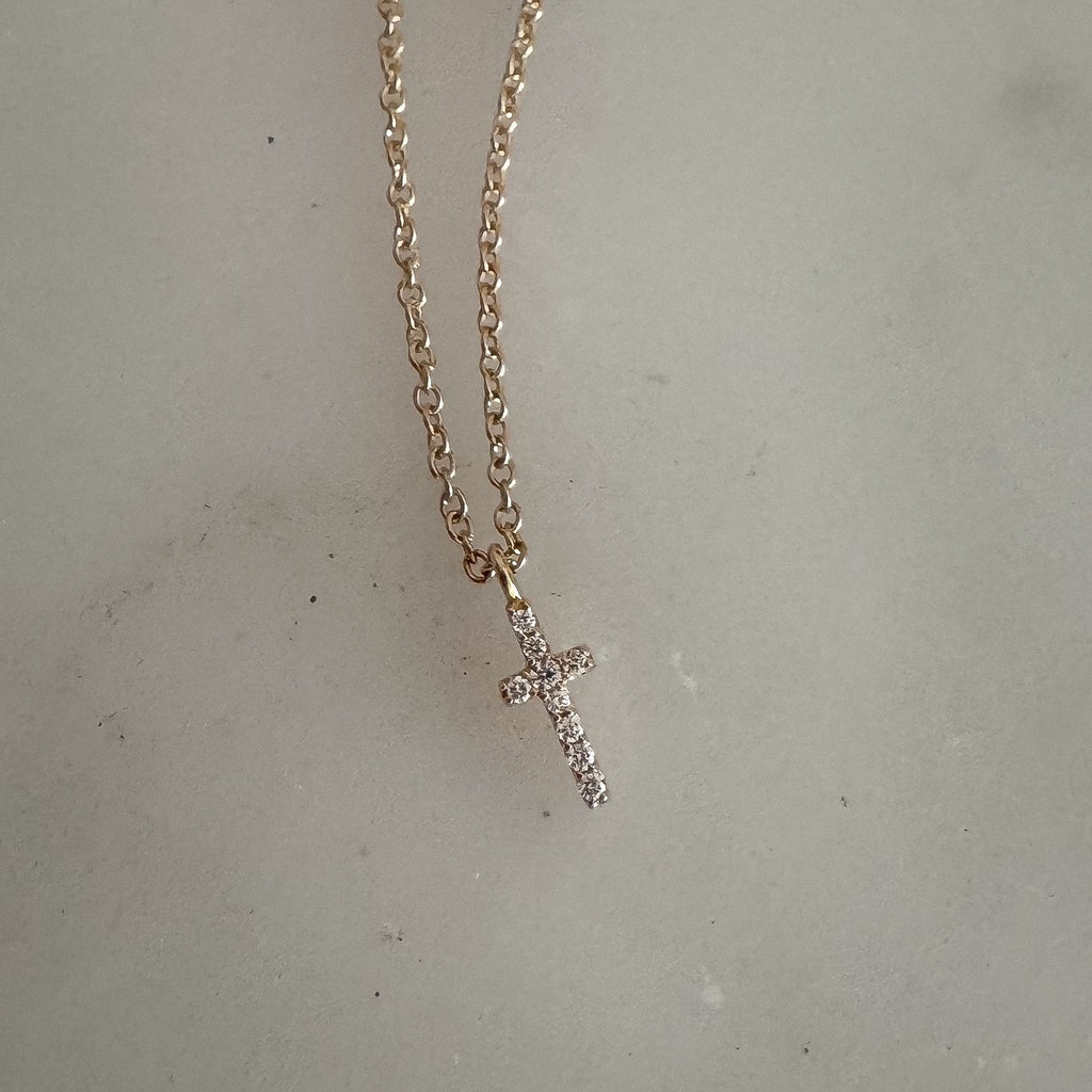 MannaA petite cross of white diamonds is suspended on a solid 14 karat gold chain. 18" Chain.
