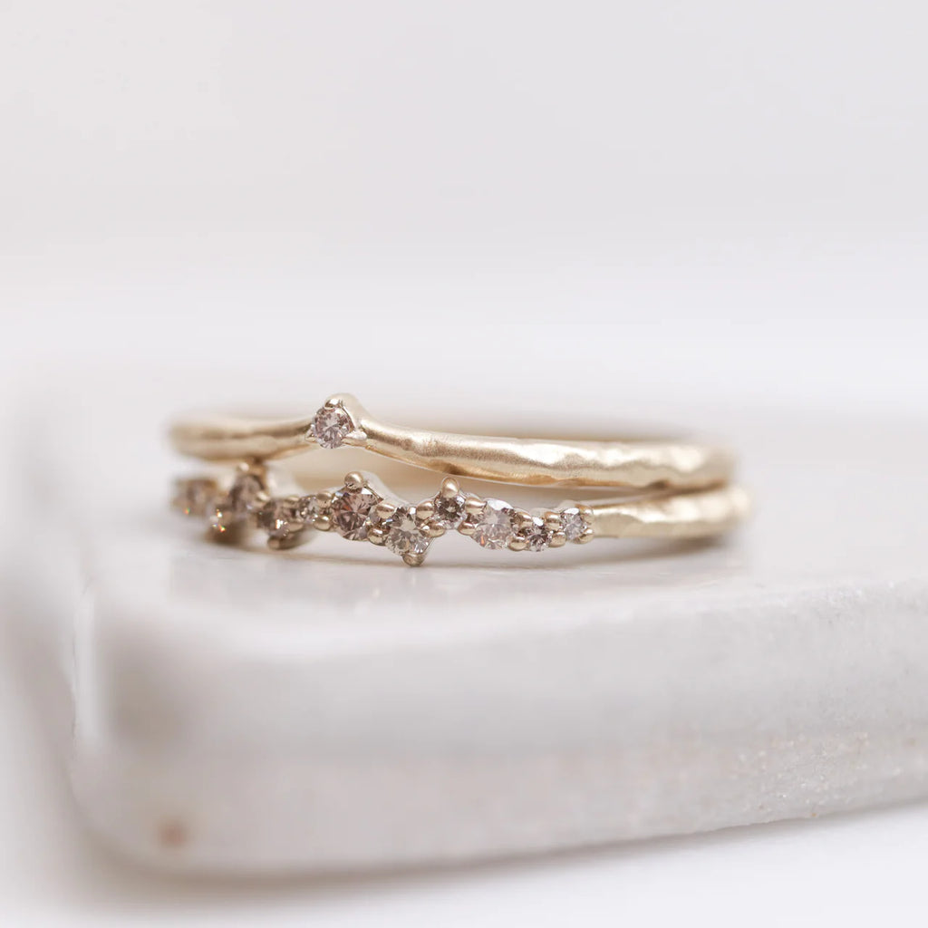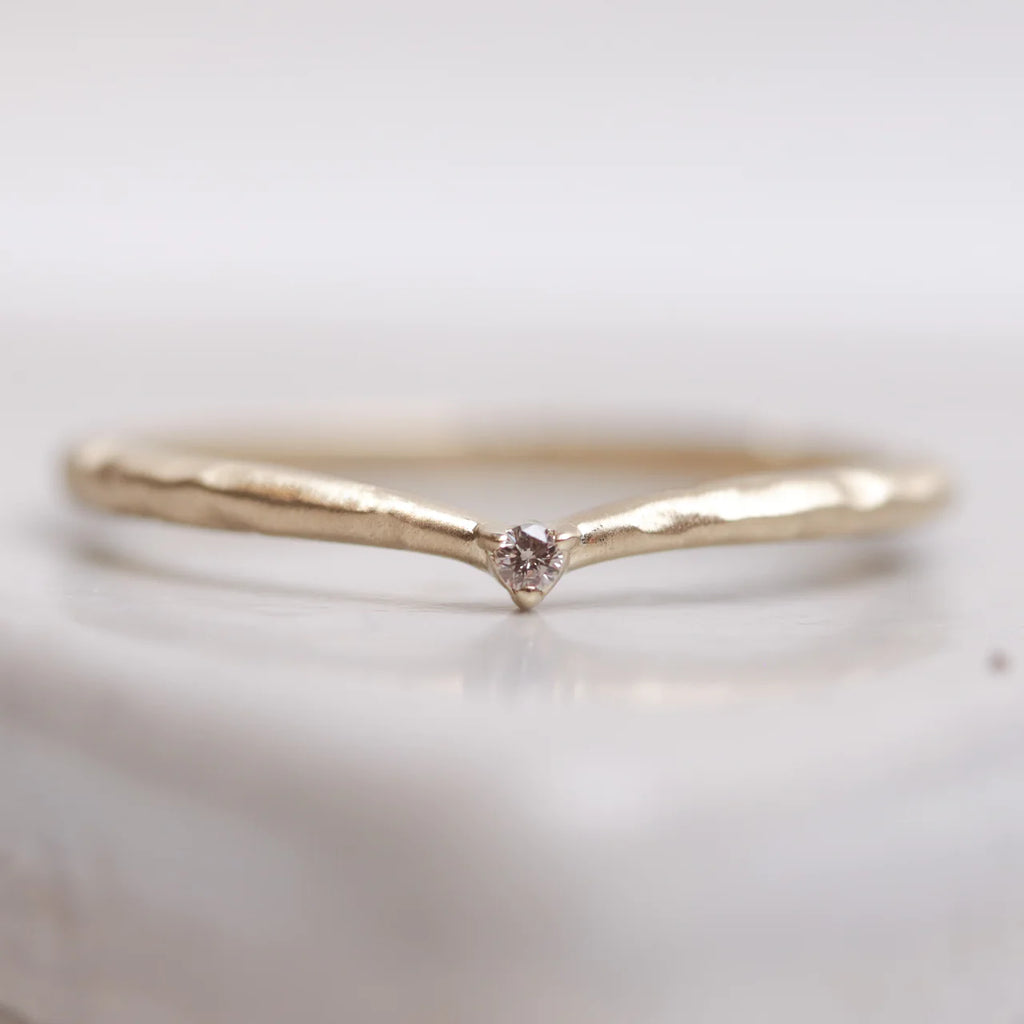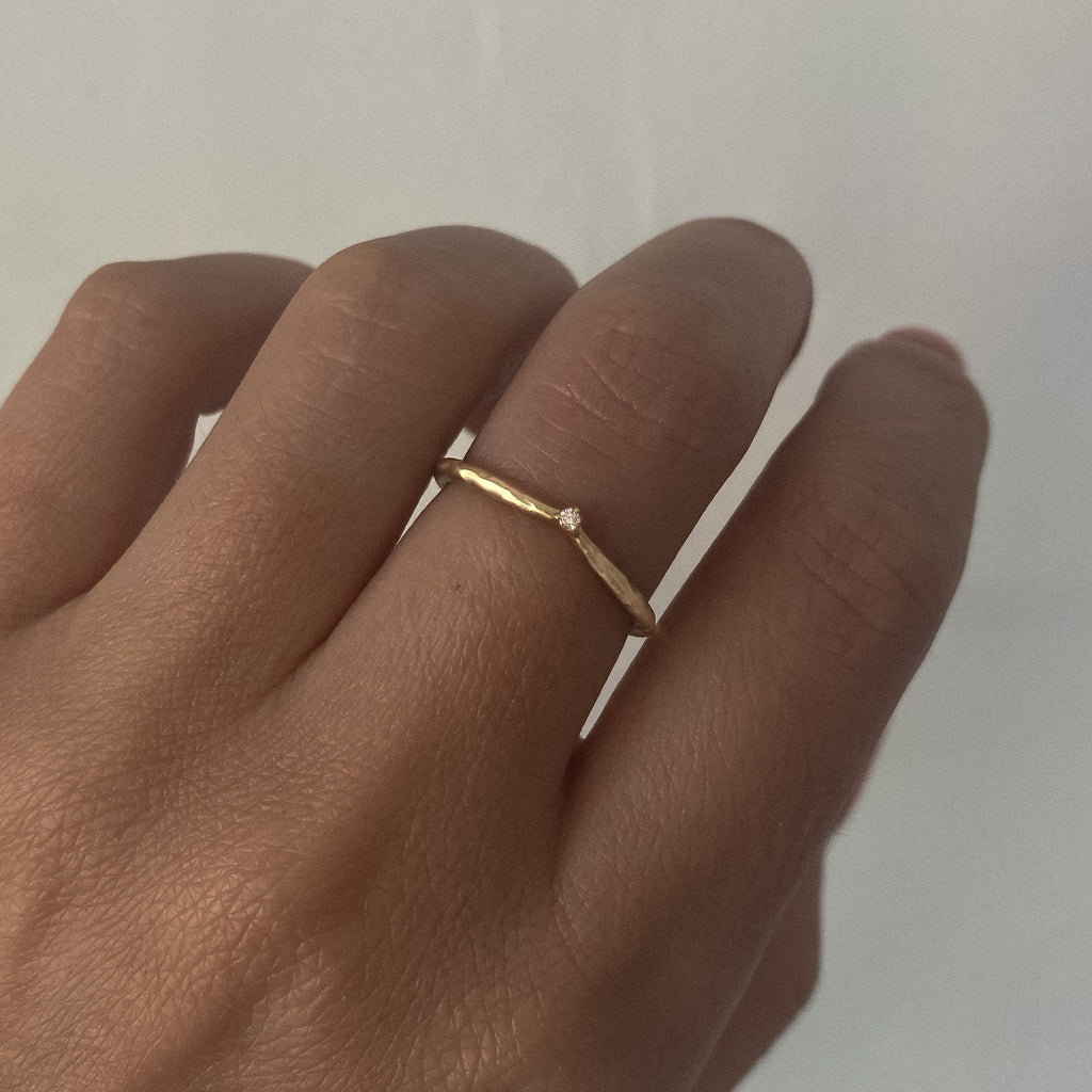 Warm 14K gold wraps the finger and holds a 1.5mm Diamond or gemstone at its peak. Beautiful as a stand alone piece, as a wedding band or within a stack.