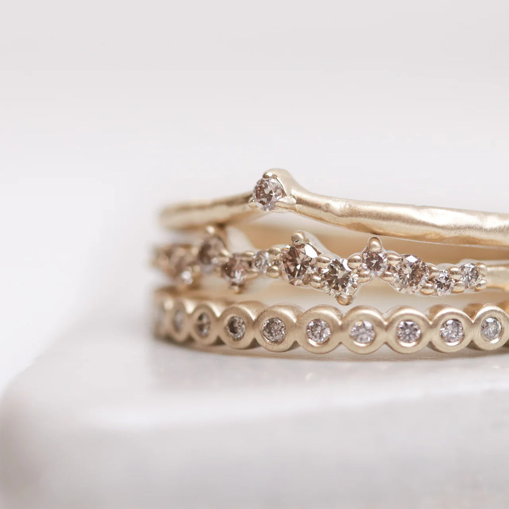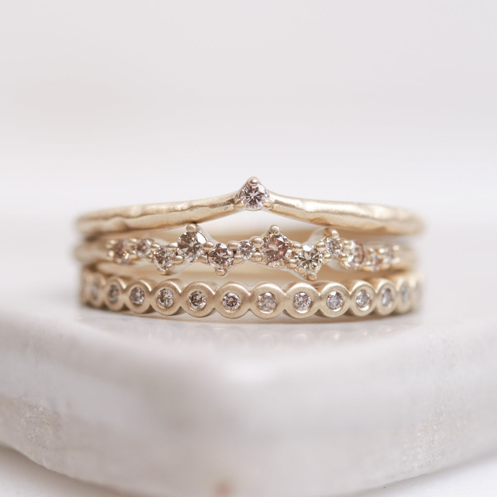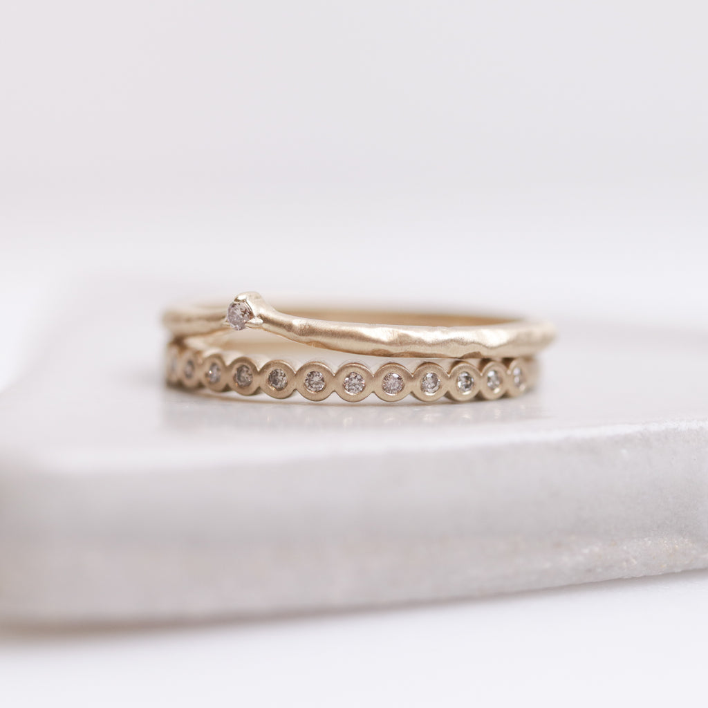 Warm 14K gold wraps the finger and holds a 1.5mm Diamond or gemstone at its peak. Beautiful as a stand alone piece, as a wedding band or within a stack.