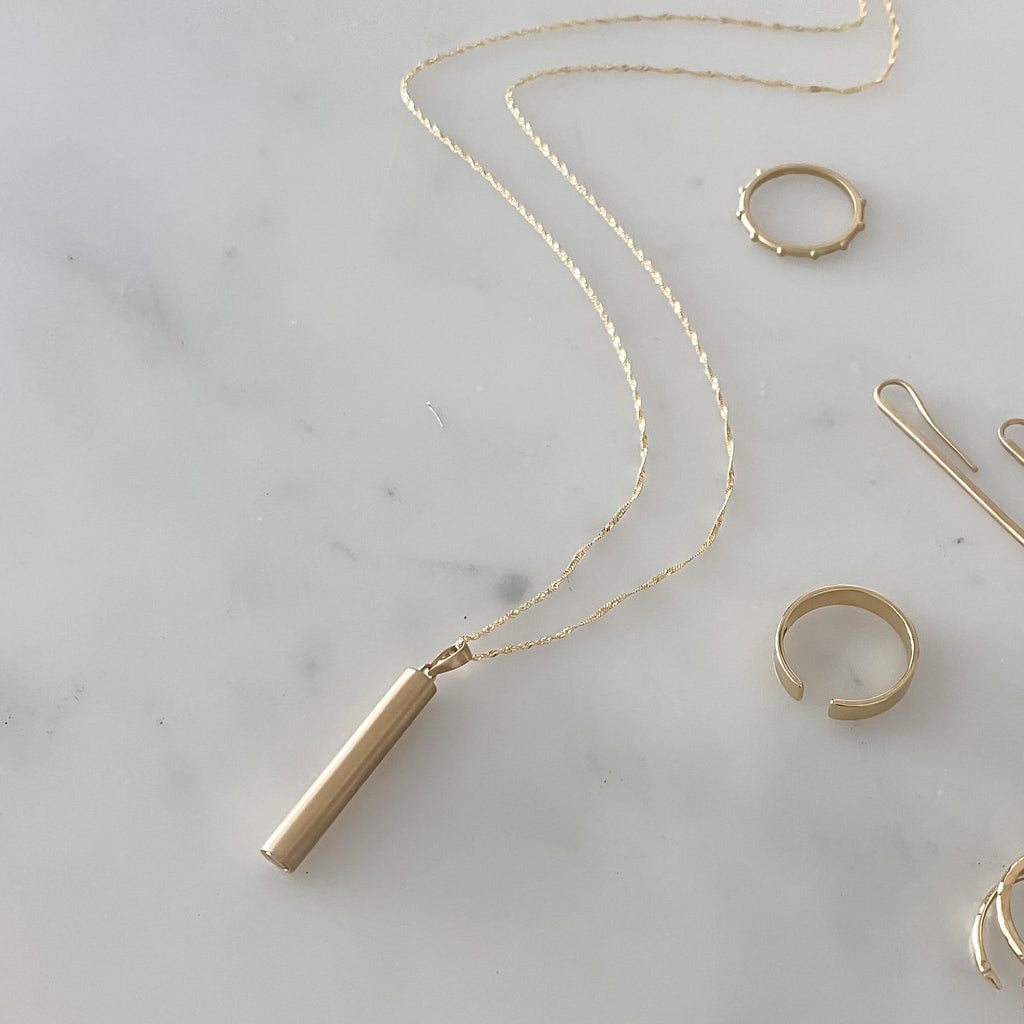 MannaA solid 14K gold, capsule pendant. Modern and minimal in appearance, this piece is made for keeping sacred material close to your heart. For use with sand or dirt from special places, ashes, dried flowers or spices. The completed necklace option includes a beautiful gold, rope chain.