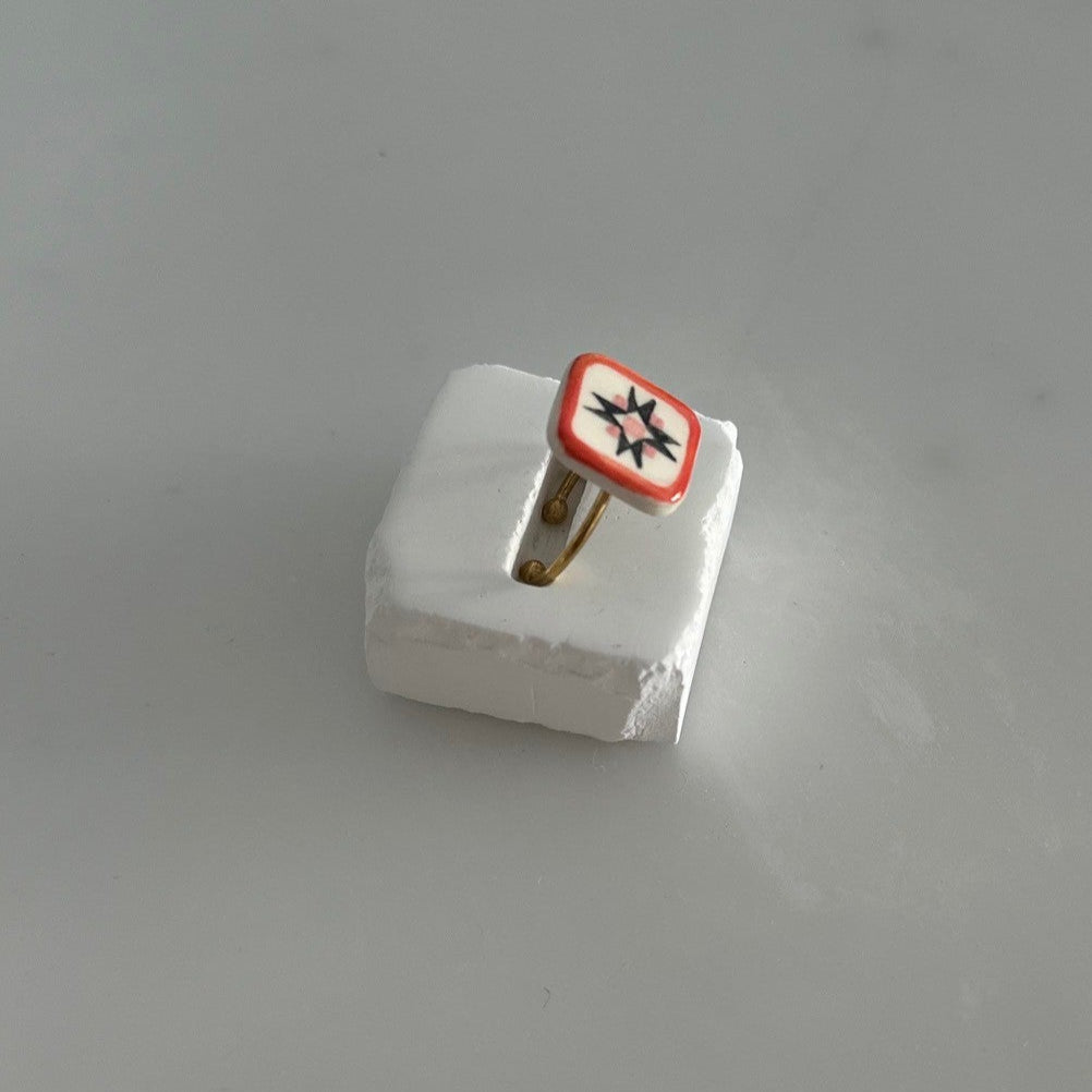 MannaHand carved and hand painted porcelain statement ring. Band is adjustable size 6-9, available on a thin gold plated band. Glazed patterns may vary slightly from photo due to the handmade nature.