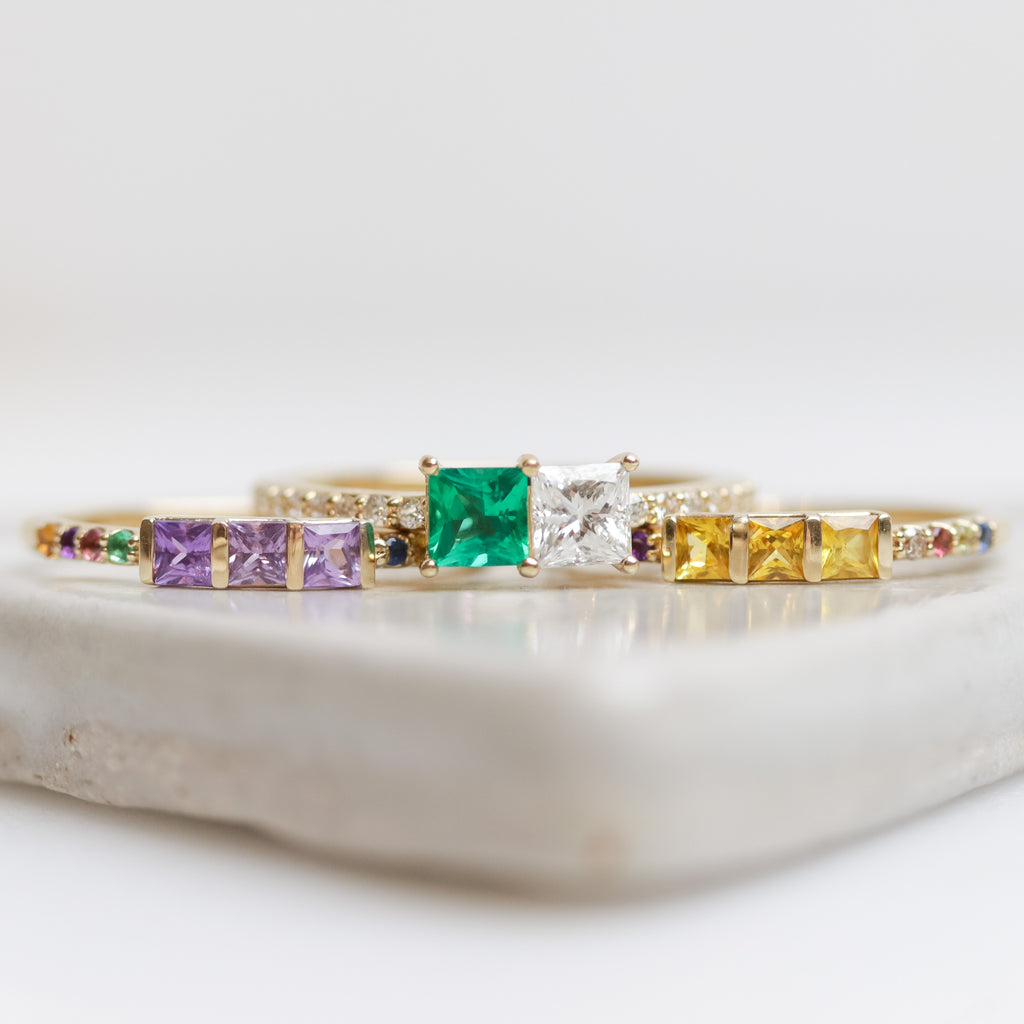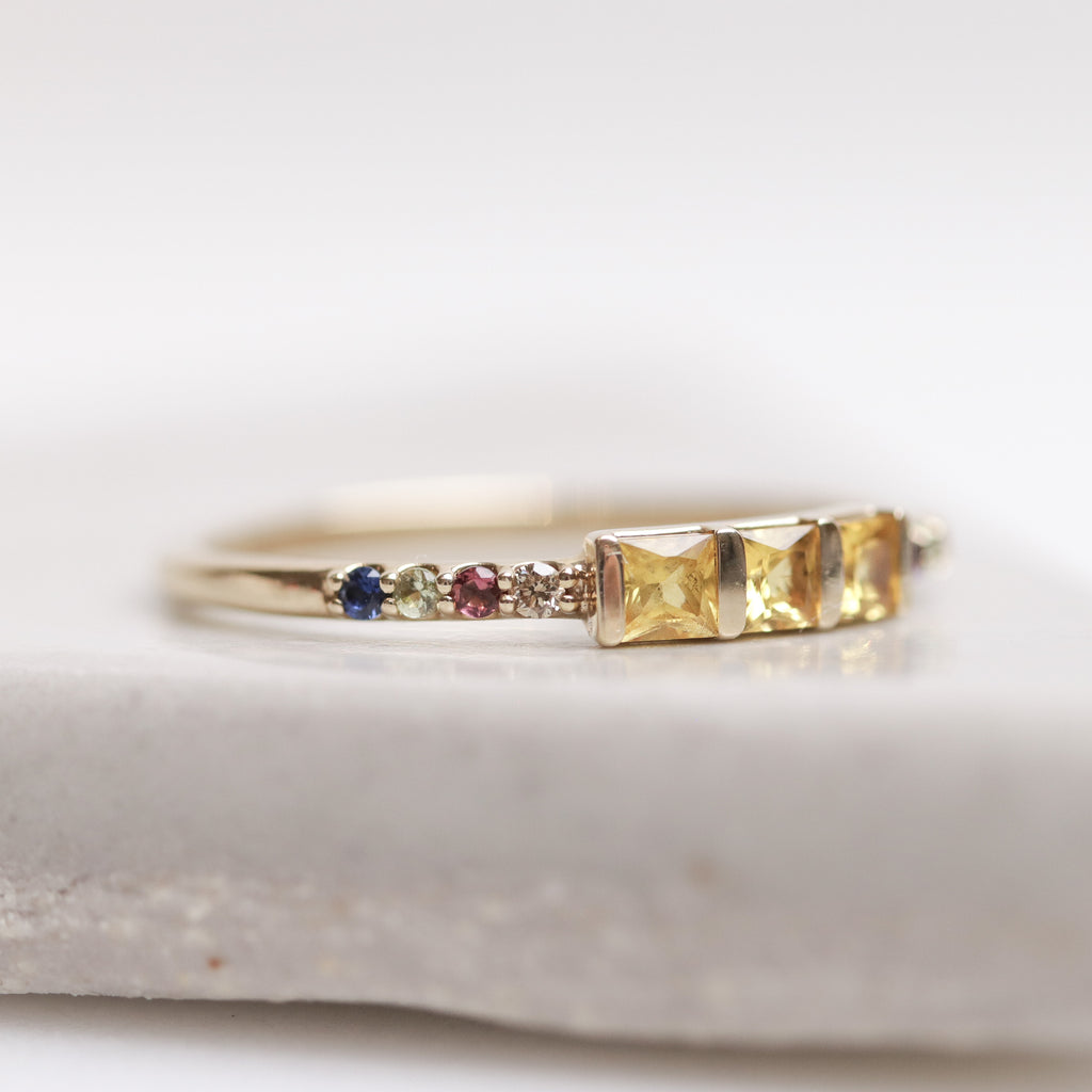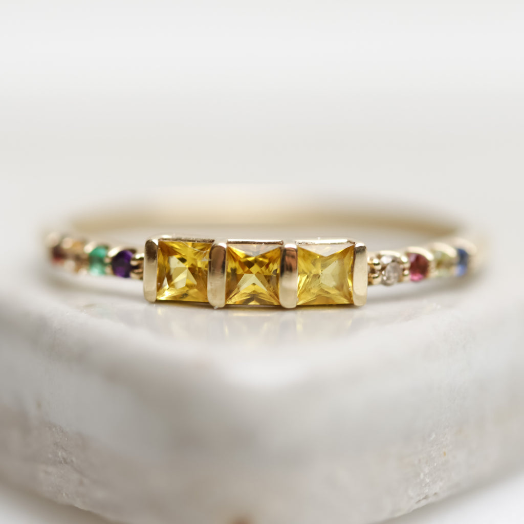 MannaWarm and bright, like a Summer night. Three princess cut, Yellow Sapphires rest within a rainbow of round, colorful gems.
