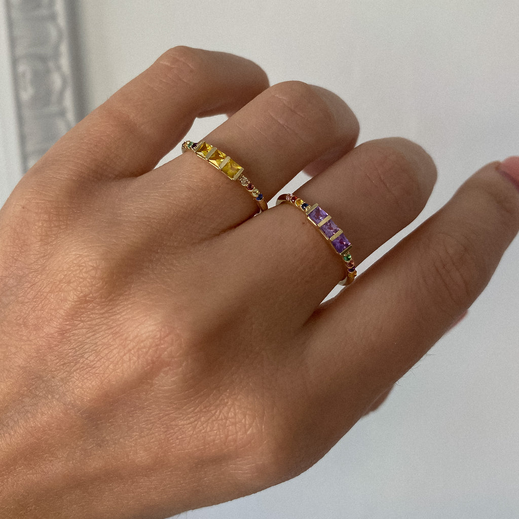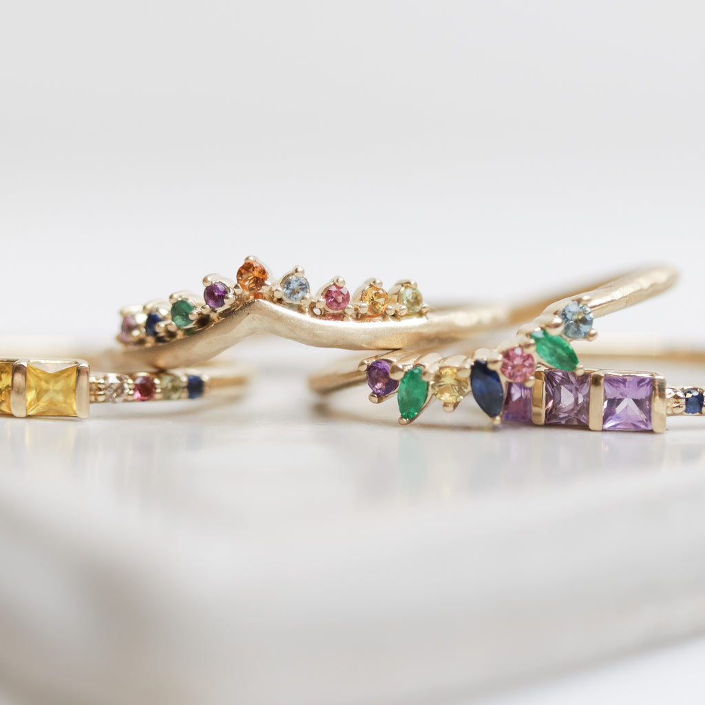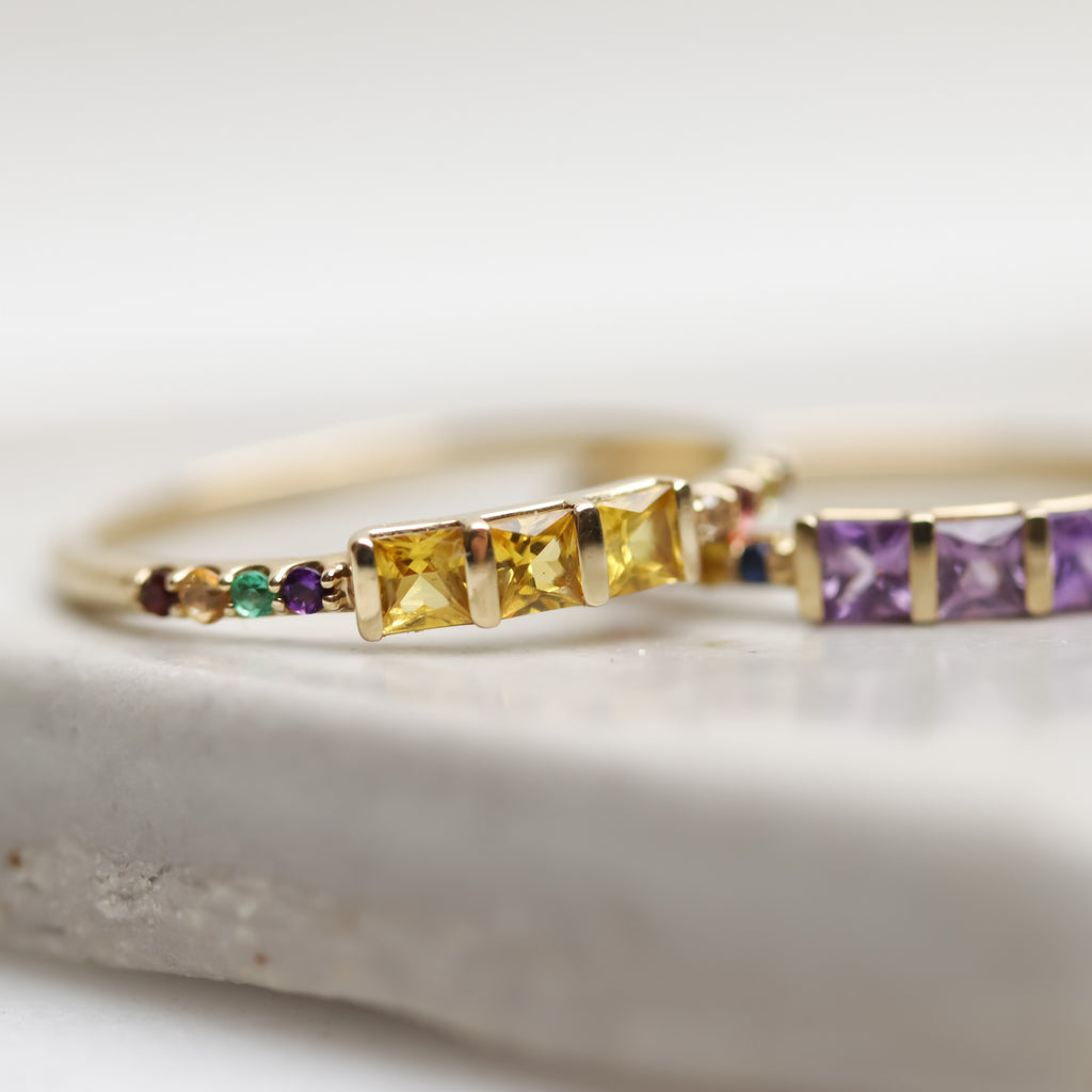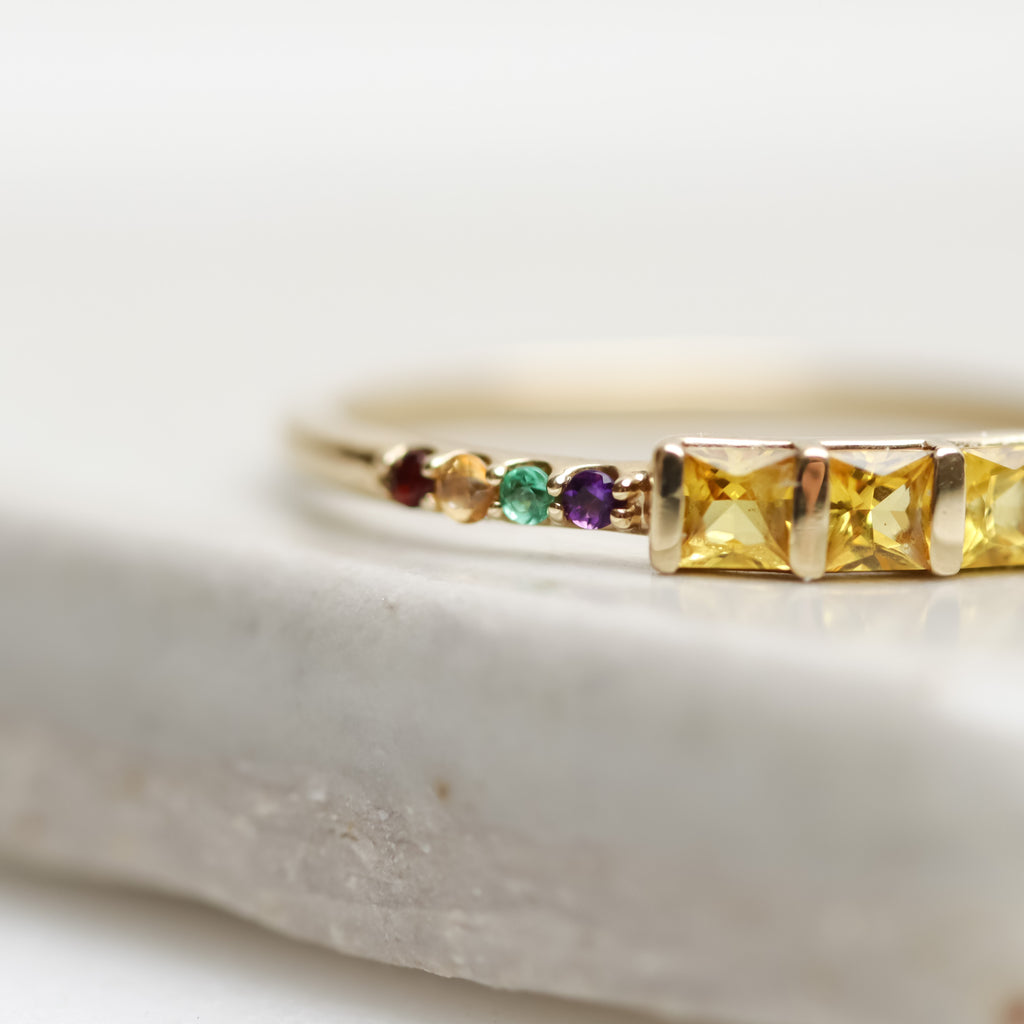 MannaWarm and bright, like a Summer night. Three princess cut, Yellow Sapphires rest within a rainbow of round, colorful gems.