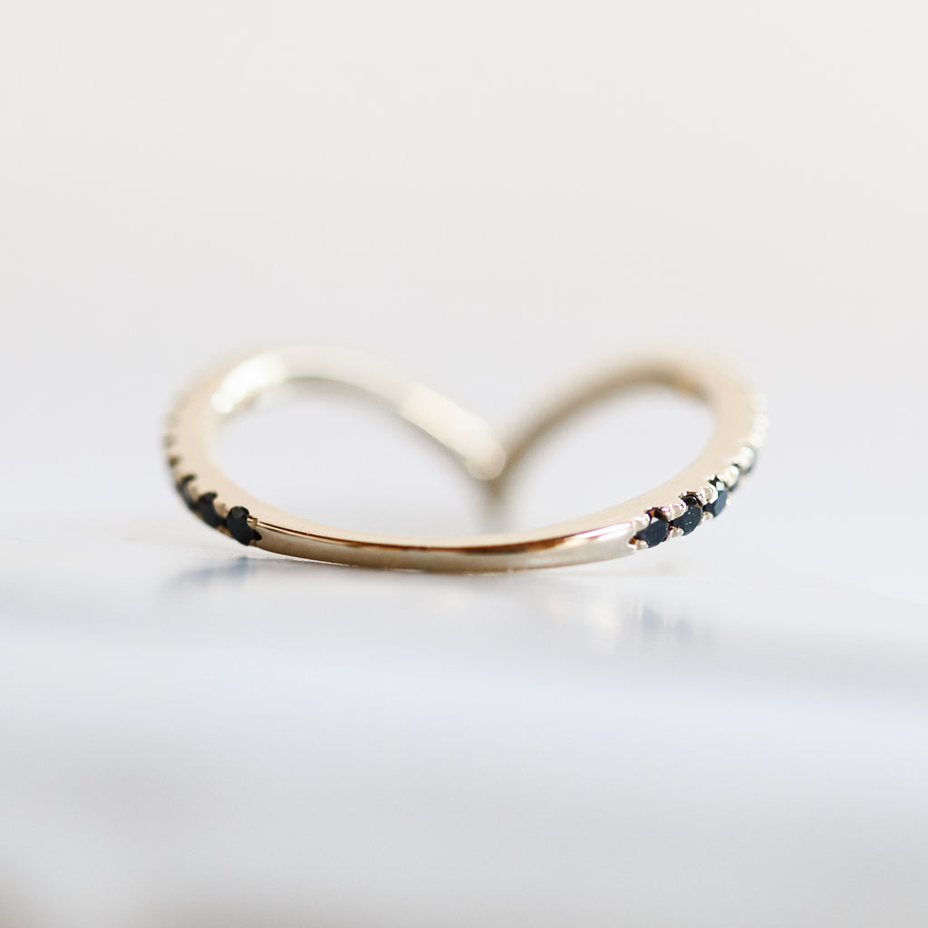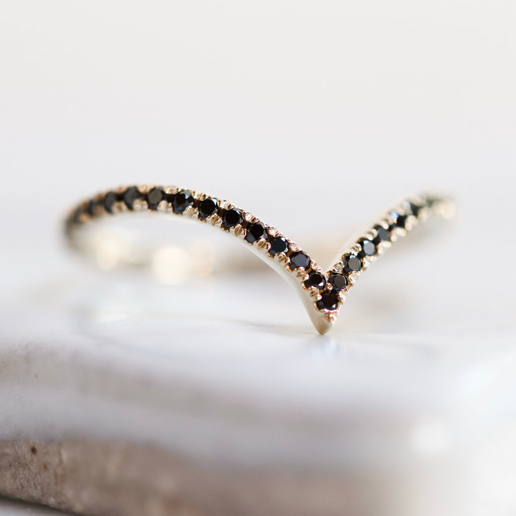 MannaA sharp "V" of black diamonds in solid 14 karat gold. This band is stunning as a stand alone piece or as a contour band when paired with a multitude of other pieces. Band is approximately 1.7mm wide. Diamonds take up 2/3 of band.