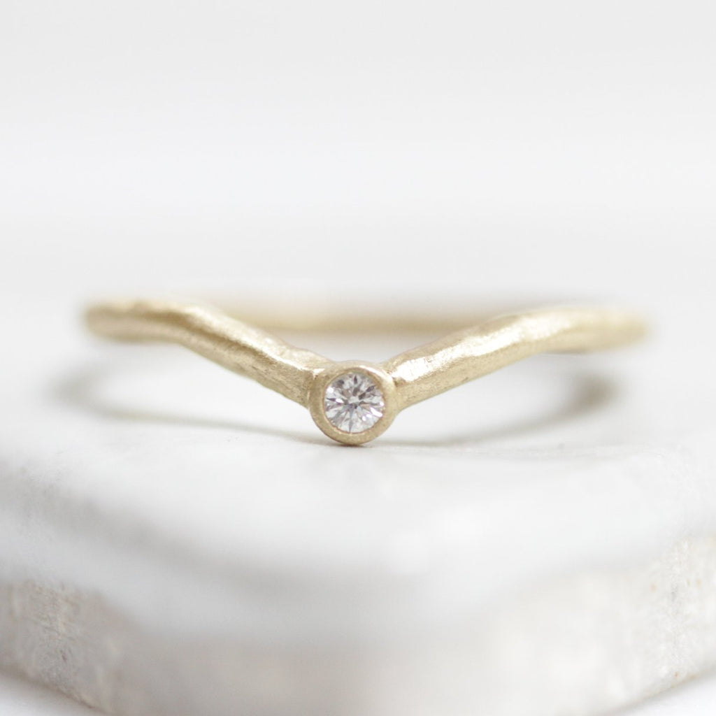 MannaA wavy and substantial band of solid 14K gold wraps the finger and holds a .06 carat (2mm) VS diamond at its peak. Beautiful as a stand alone piece, or within a stack. Every ring is one of a kind.