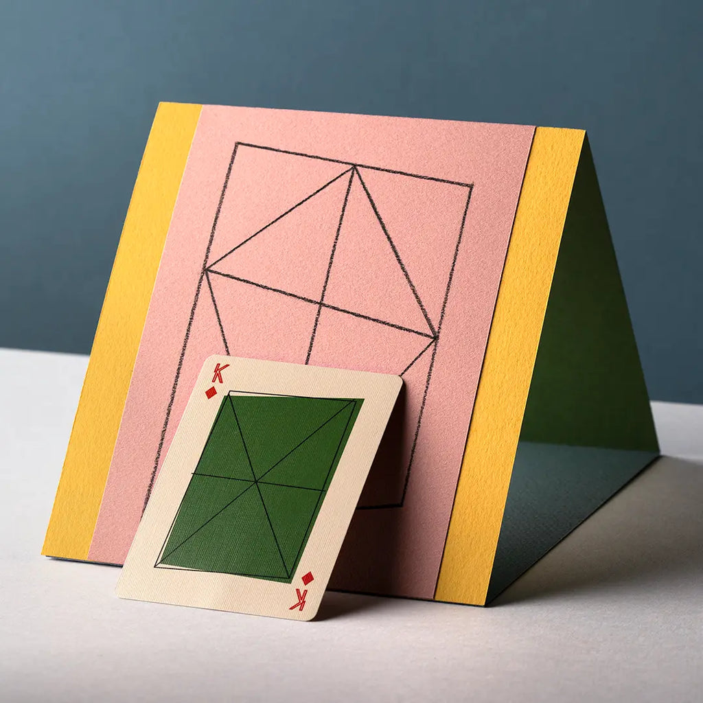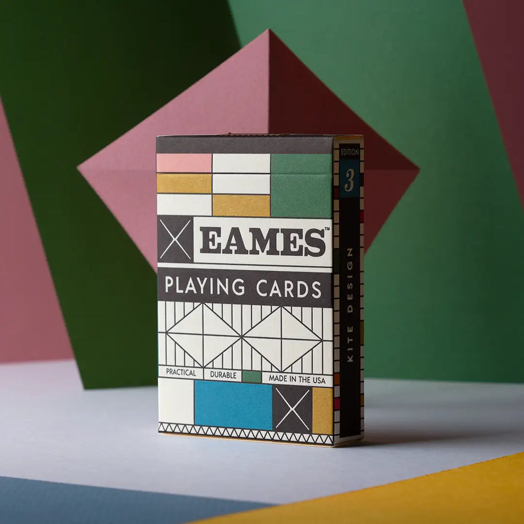 Eames "Kite" Playing Cards take inspiration from a tissue-paper kite designed by Charles Eames in 1950. These cards come in a letterpress printed box celebrating the house Charles and Ray designed and built.