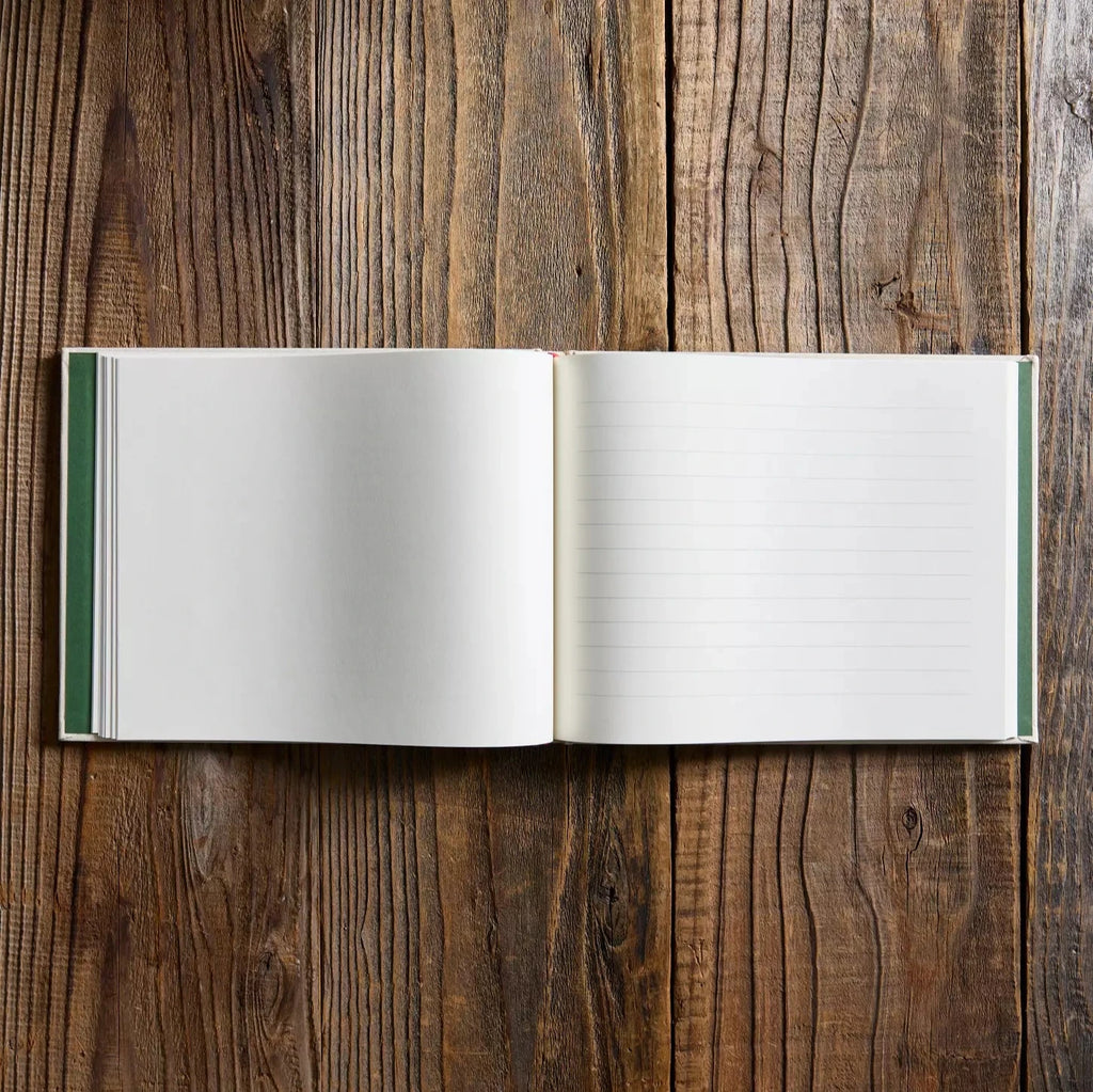 MannaThis embroidered guest book features a large hardcover with 144 interior pages half lined and half blank so guests can write a note, add in a sketch, or paste in a photo to create a one-of-a-kind keepsake. The cover is wrapped in book cloth and embroidered with a Christmastide Pomegranate design, finished with a grosgrain ribbon bookmark to save your place.