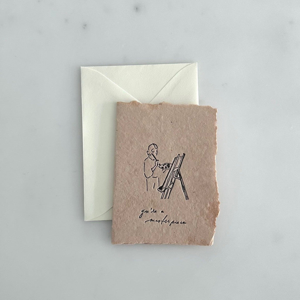 Card features an illustration of an artist at her canvas and handwritten “you’re a masterpiece.”