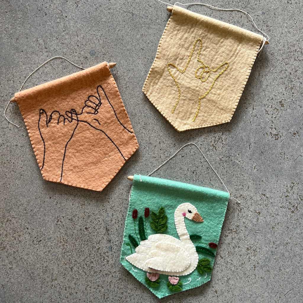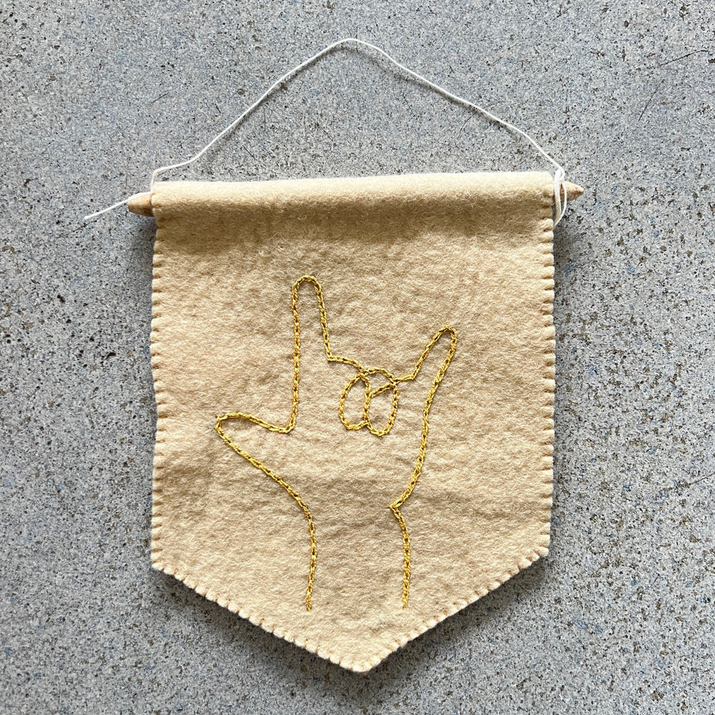 MannaIn American Sign Language, this sign is used to say, "I love you." The pennant-style flag is made of 100% natural sheep's wool, felted and finished with a metallic chain stitched hand, complete with the pointed thumb and index finger to form an "L".