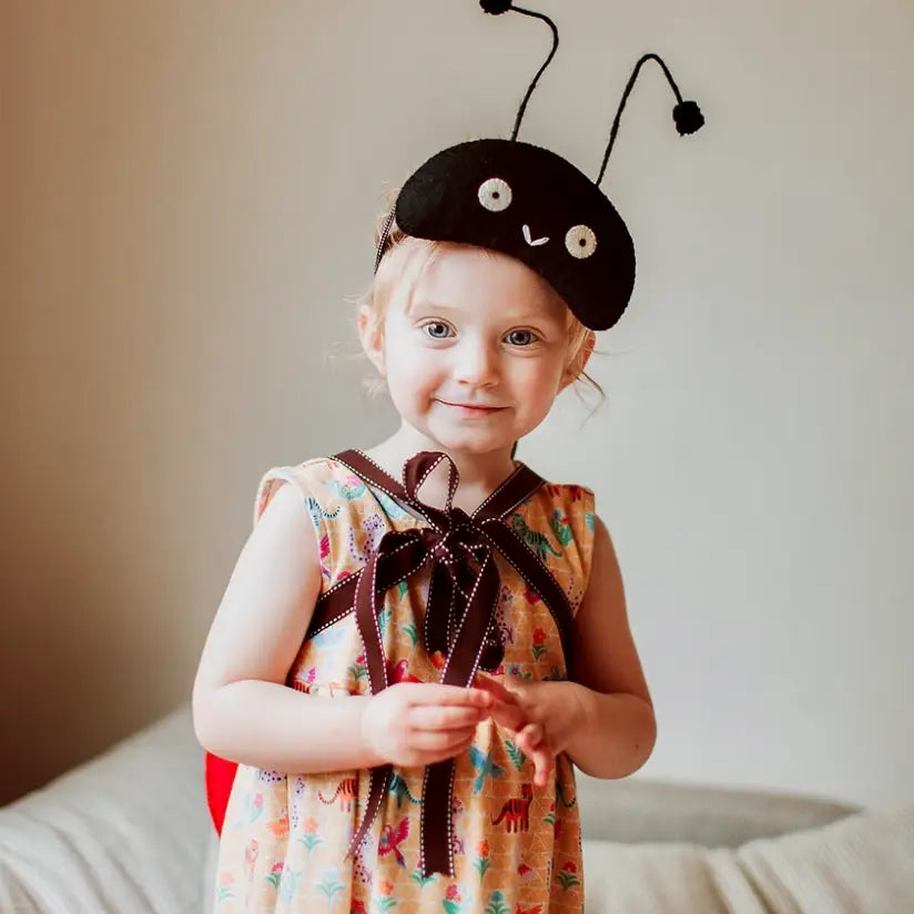 MannaSweet little face with pom pom feelers and comfy padded spotty wings. Needle felted detail brings each dressing up set to life while vintage saddle stitched ribbons tie securely around the back of the head and across the chest. One size fits all.