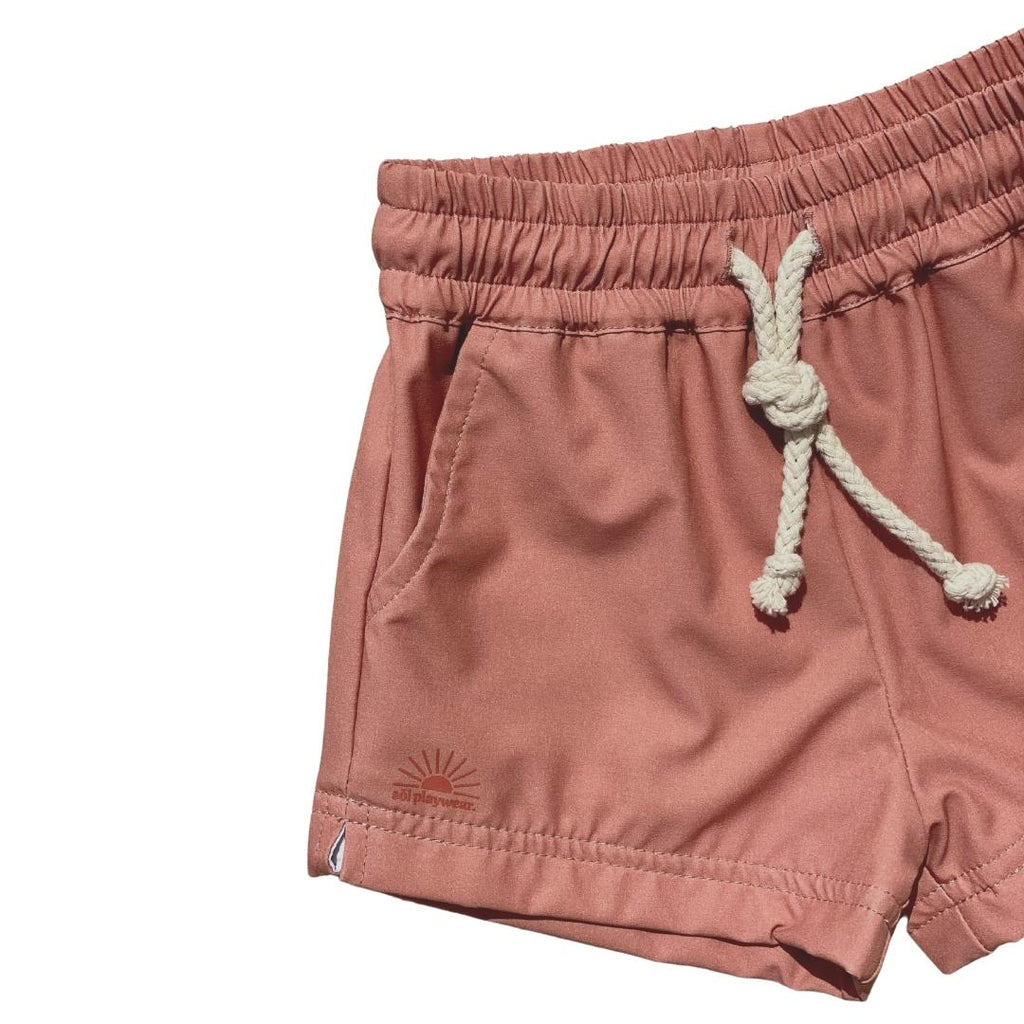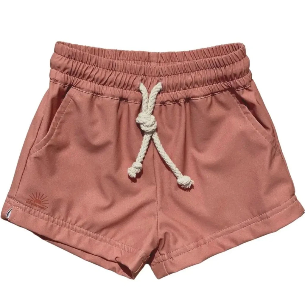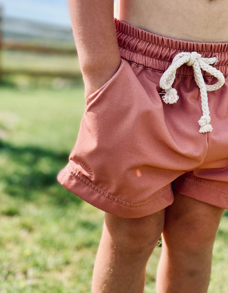MannaBaggy swim shorts made with 86% recycled plastic & without the use of unnecessary metal or plastic accessories. Featuring an easy-fit elastic waistband & adjustable cotton drawstring for custom fit. Quick-dry liner and two front pockets for collecting tiny treasures. Designed by a mama in Southwest Colorado & mindfully made to provide comfort for any adventure; in the water, or on land.