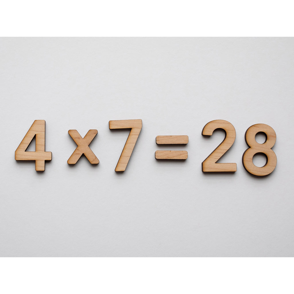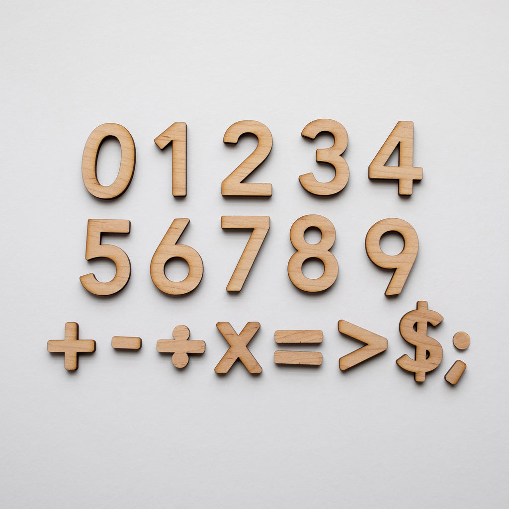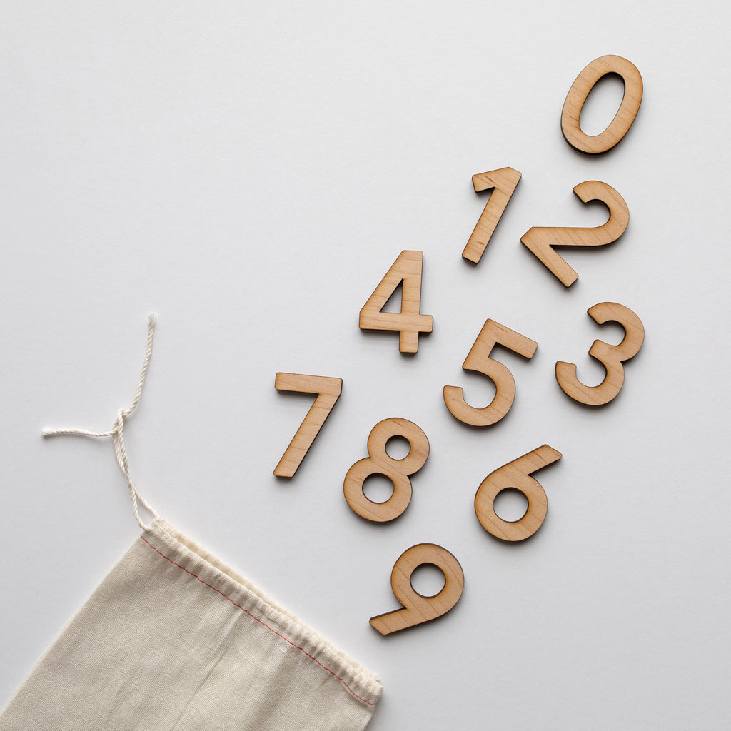 This wooden number set is made of solid maple wood and is easy for little ones to grasp as they learn numeracy through play. Set includes: Digits 0-9 (10 pieces) and common math symbols (9 pieces) including plus sign, minus sign, division sign, multiplication sign, equals sign, greater than/less than sign, comma, decimal point, and dollars sign. Comes in a cloth drawstring bag for safekeeping and sustainable, eco-friendly storage. Use these wood numbers to identify and order numerals, practice math problems, and explore money and place value. Crafted by hand in Ohio, from locally sourced wood. Sealed with food-grade mineral oil and safe for kids.