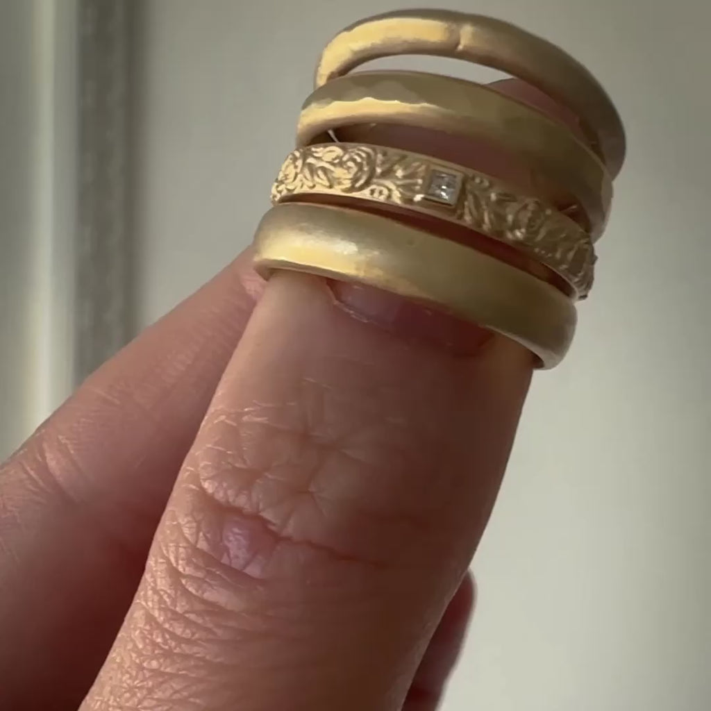 An ethereal, raised floral design flows atop thick gold and covers the entire circumference of the band. Matte brushed, and created in solid 10k, 14k, or 18k gold (yellow, rose or white). A brilliant, 1.3mm princess cut diamond shimmers in place of one of the rosettes. This is a beautifully substantial piece. It is stunning as an engagement ring, wedding band or within a stack. 3.1mm wide and 2.3mm thick.