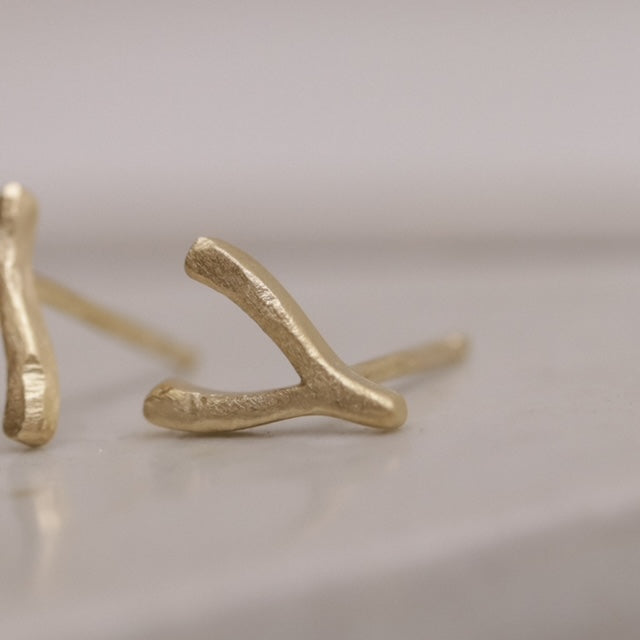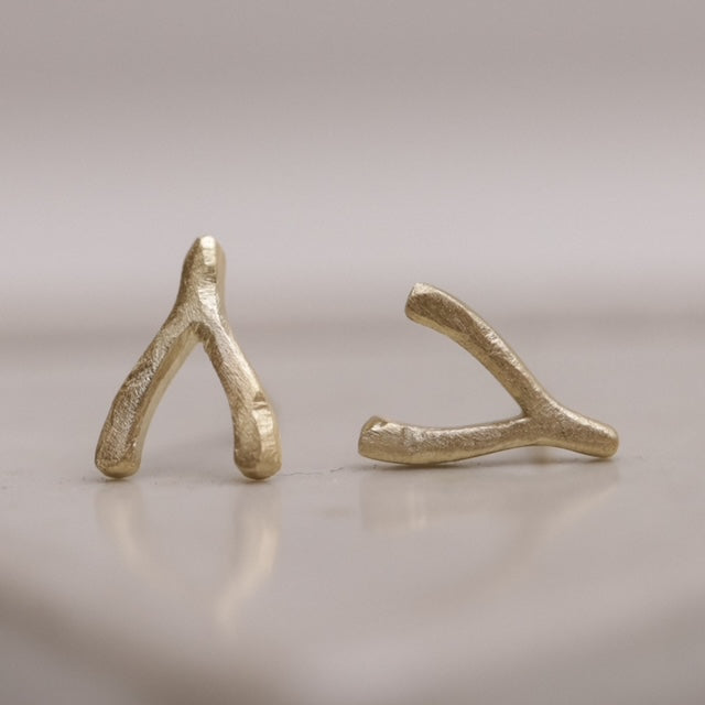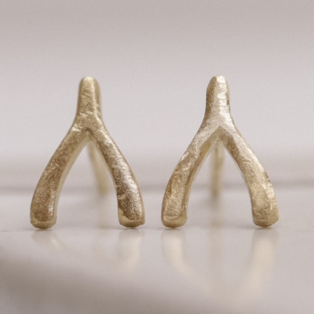 MannaSolid 14k gold wishbone earrings (studs). Featuring hand carving and a beautiful matte brushed finish. Sold as a pair.