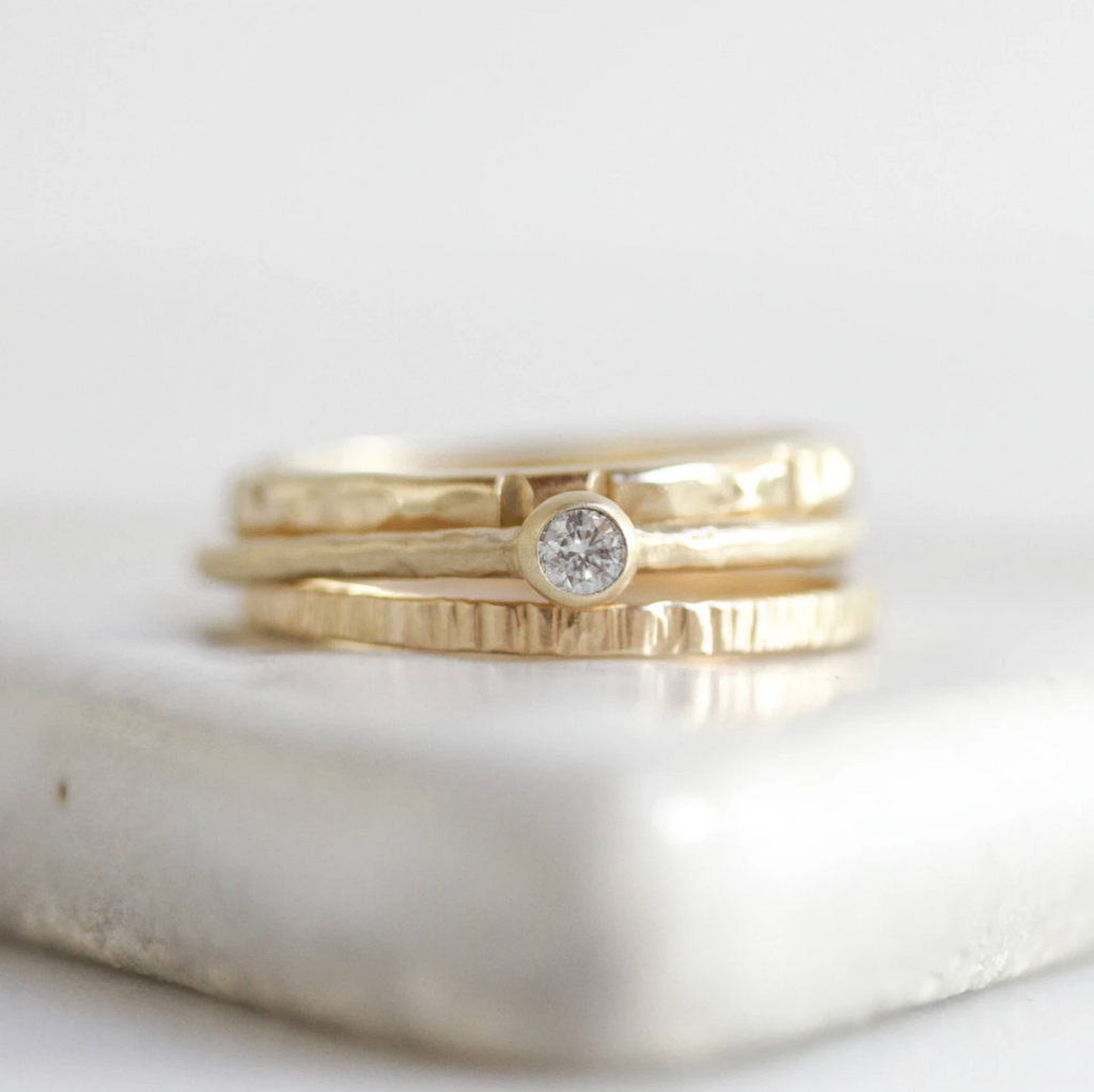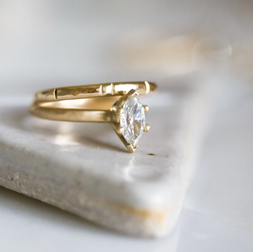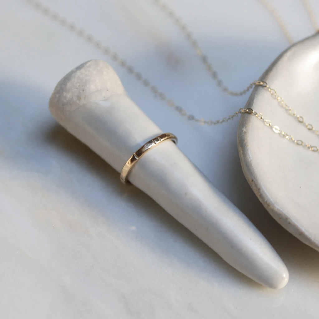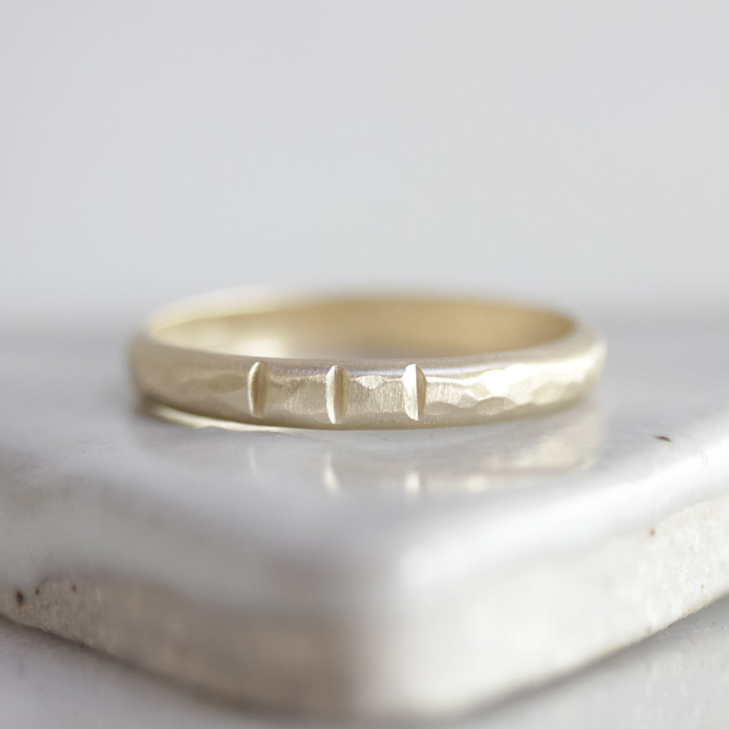 This beautifully organic, 14 karat gold ring has a subtle wave and gentle hammer texture that catches the perfect amount of light. Notches are carefully hand carved into the gold at random, making each piece one of a kind. All of our texturing is hand carved, hand hammered or hand etched, making every ring subtly one of a kind. A striking wedding band, stack addition or stand alone piece. Pictured 2mm and 3mm.