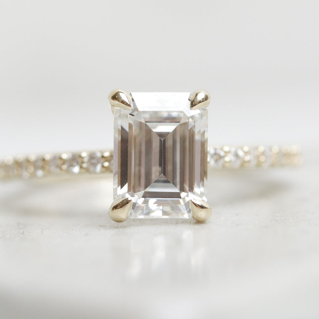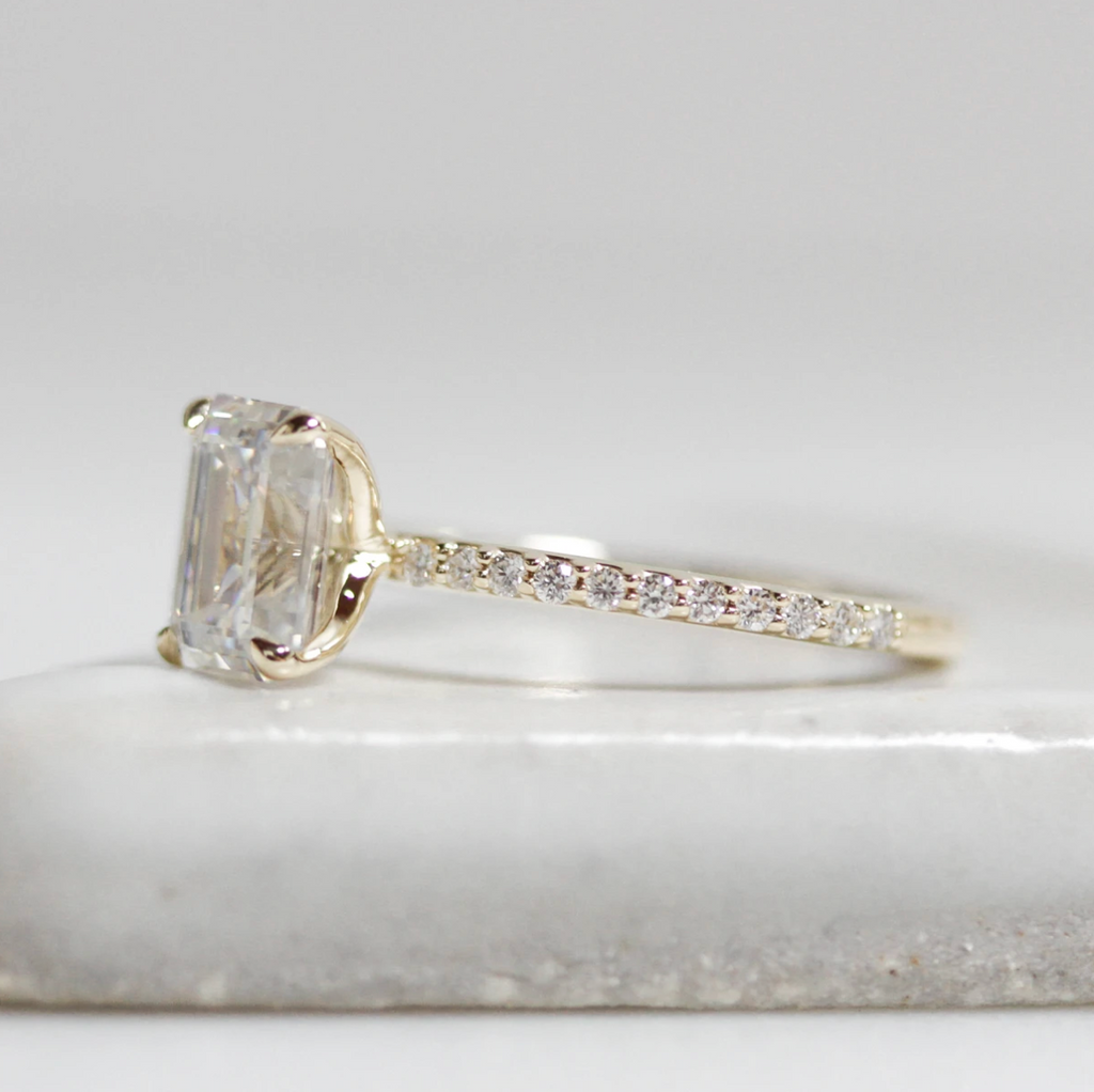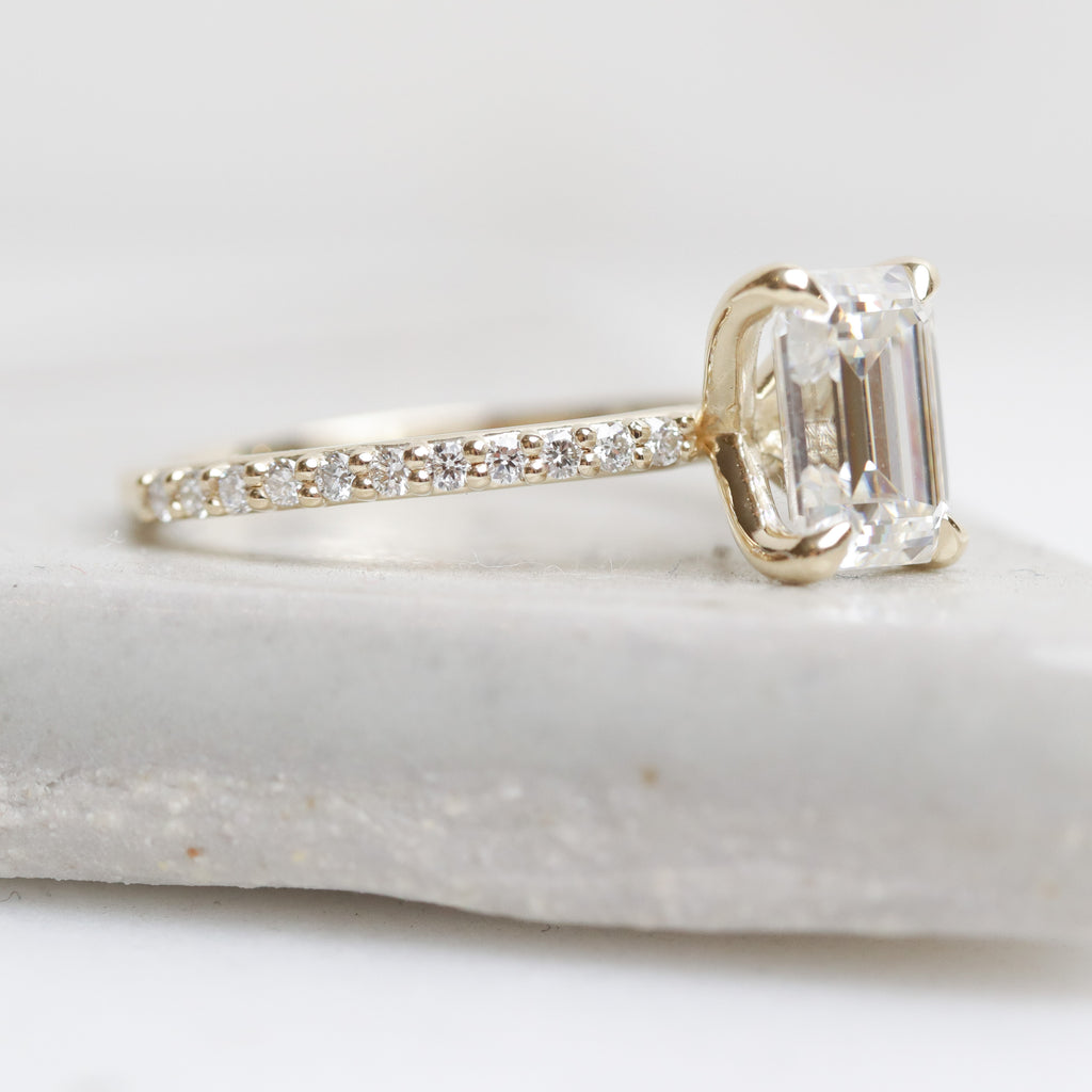 MannaA striking 8mm x 6mm (1.75 carat diamond equivalent) Emerald/step cut Diamond or gemstone rests within 4 prongs and sits atop a timeless Diamond pavé band. Solid 14 karat.