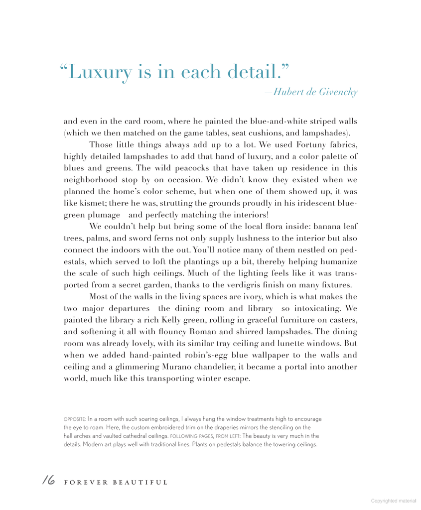 In twelve chapters, he shares inspiration and advice from homes he has designed across America and abroad. There is a house for every month of the year, inspired by the seasons, from April’s leafy green Gardens of Versailles–inspired French Chateau-style home outside of Chicago to crisp navy in East Hampton for June, August’s homage to the pink sands in Bermuda, and holiday reds for December’s Swiss-style chalet on a sweeping horse ranch near Sun Valley, Idaho.